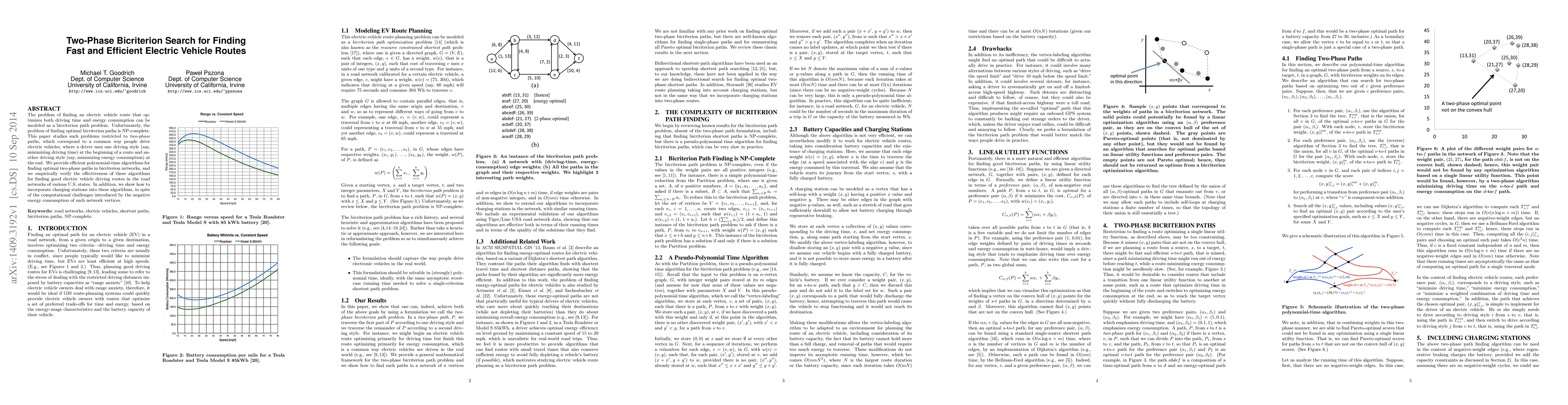 This paper proposes efficient algorithms for finding optimal two-phase paths in bicriterion networks that balance driving time and energy consumption for electric vehicle routes. The study empirically verifies the algorithms' effectiveness in U.S. road networks and addresses the inclusion of charging stations despite their negative energy impact.