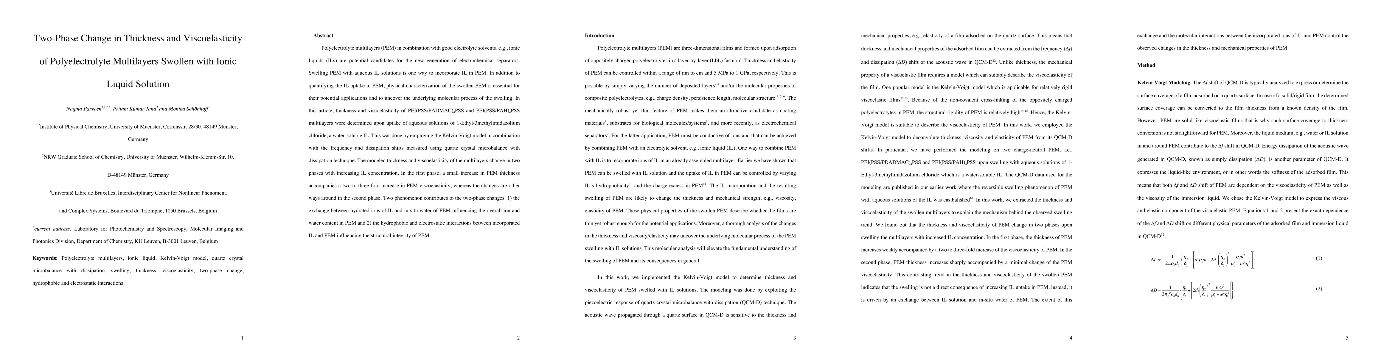 This paper investigates the thickness and viscoelasticity changes in polyelectrolyte multilayers (PEM) swollen with ionic liquid solutions, revealing two-phase behavior. The study finds that the initial phase shows increased viscoelasticity with slight thickness increase, while the second phase exhibits the opposite trend, attributed to ion exchange and structural interactions.