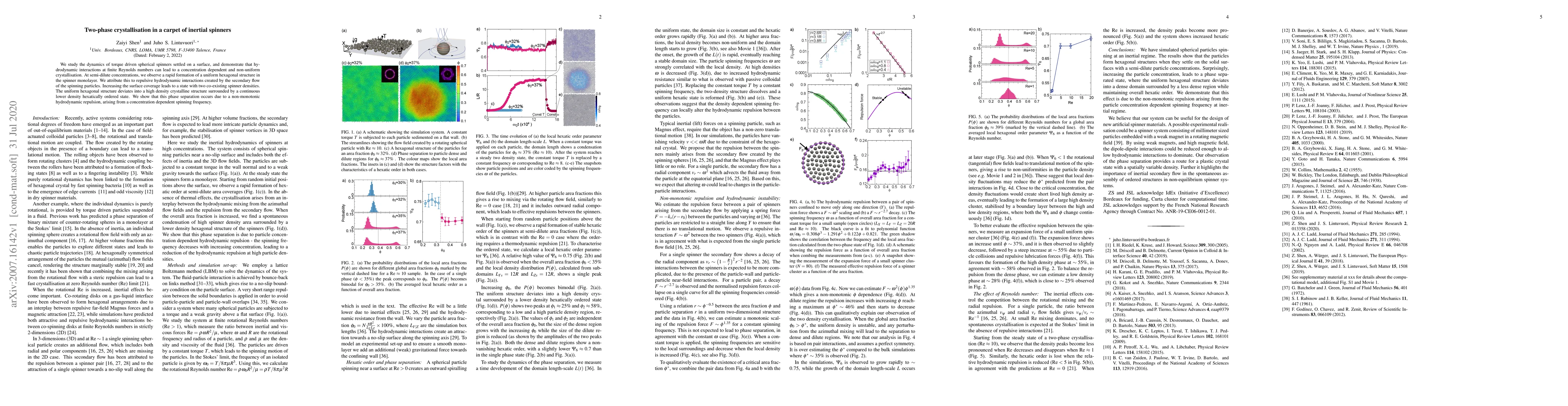 We study the dynamics of torque driven spherical spinners settled on a surface, and demonstrate that hydrodynamic interactions at finite Reynolds numbers can lead to a concentration dependent and non-uniform crystallisation. At semi-dilute concentrations, we observe a rapid formation of a uniform hexagonal structure in the spinner monolayer. We attribute this to repulsive hydrodynamic interactions created by the secondary flow of the spinning particles. Increasing the surface coverage leads to a state with two co-existing spinner densities. The uniform hexagonal structure deviates into a high density crystalline structure surrounded by a continuous lower density hexatically ordered state. We show that this phase separation occurs due to a non-monotonic hydrodynamic repulsion, arising from a concentration dependent spinning frequency.