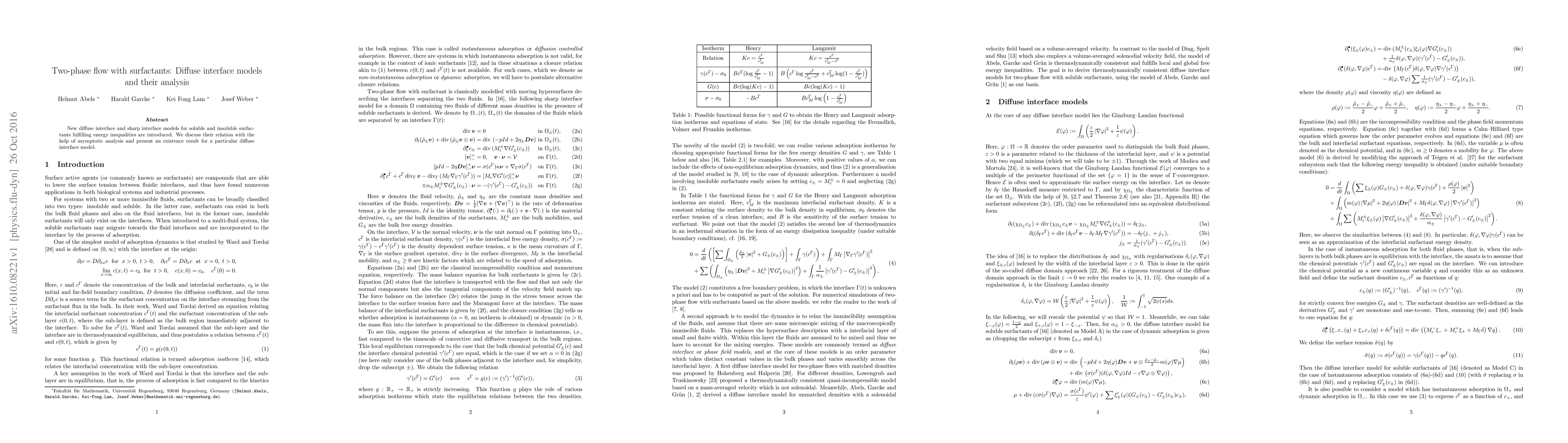 New diffuse interface and sharp interface models for soluble and insoluble surfactants fulfilling energy inequalities are introduced. We discuss their relation with the help of asymptotic analysis and present an existence result for a particular diffuse interface model.