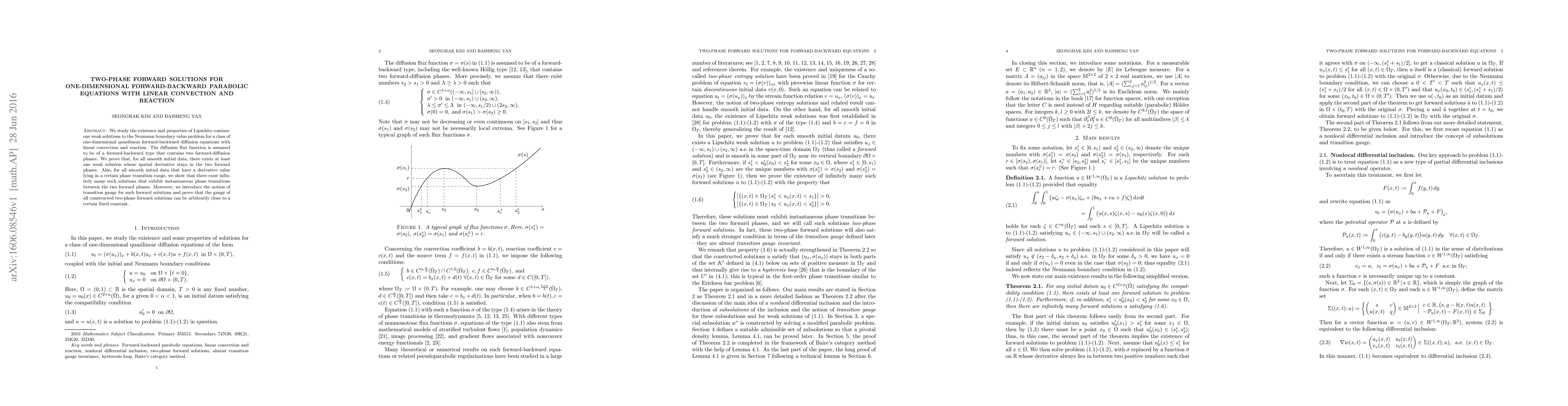 This paper investigates the existence and properties of Lipschitz continuous weak solutions for one-dimensional quasilinear forward-backward parabolic equations with linear convection and reaction. It demonstrates the existence of at least one solution for smooth initial data and infinitely many solutions with phase transitions for specific initial conditions, introducing a transition gauge concept.