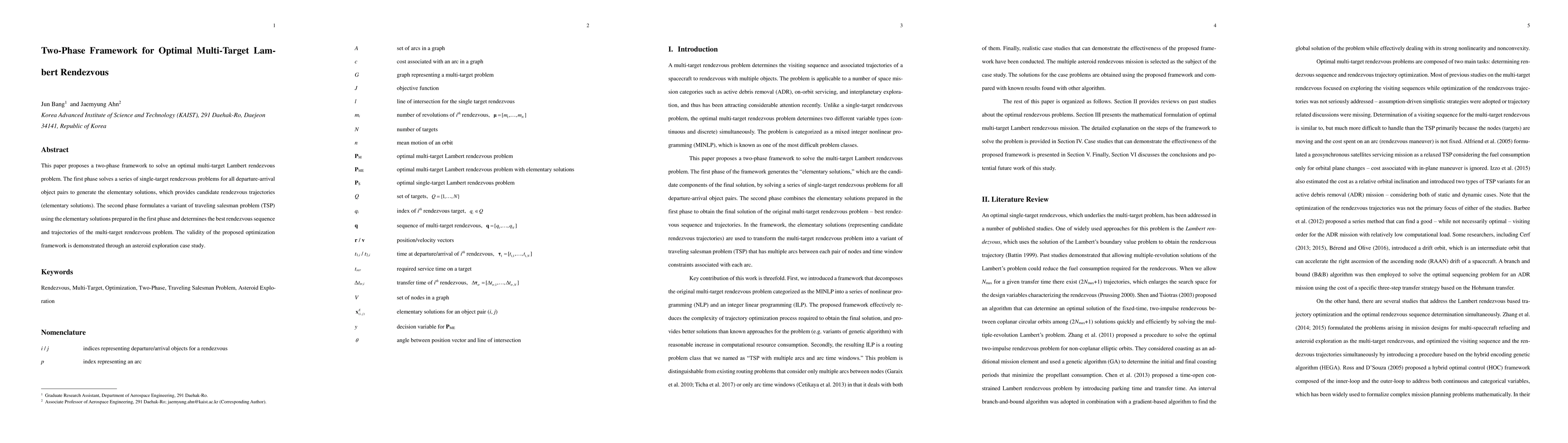 This paper introduces a two-phase framework to optimize multi-target Lambert rendezvous, generating elementary solutions via single-target problems and determining the best sequence using a TSP variant, validated through an asteroid exploration case study.