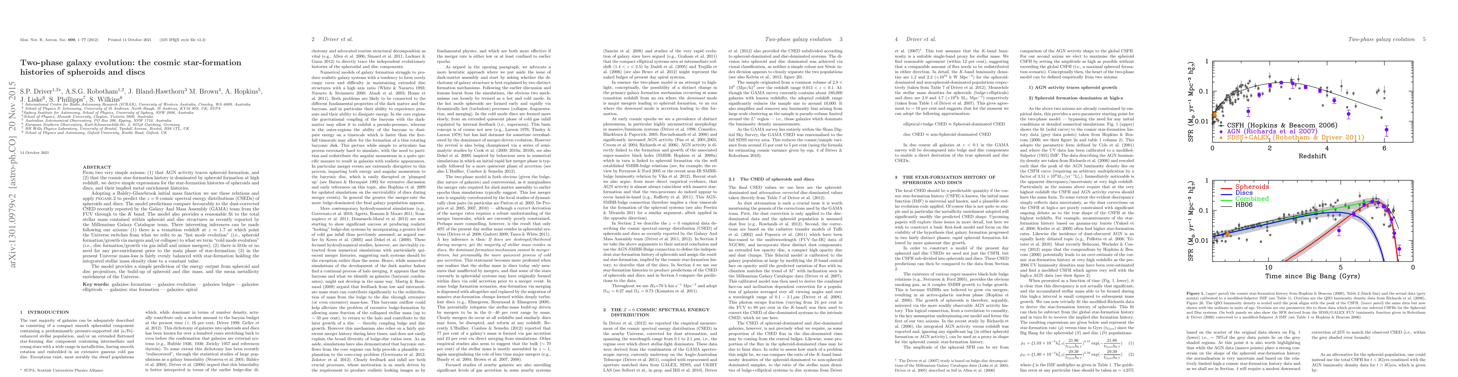 The paper introduces a two-phase galaxy evolution model based on empirical data, providing simple expressions for star-formation histories of spheroids and discs, and predicting their z=0 CSEDs.