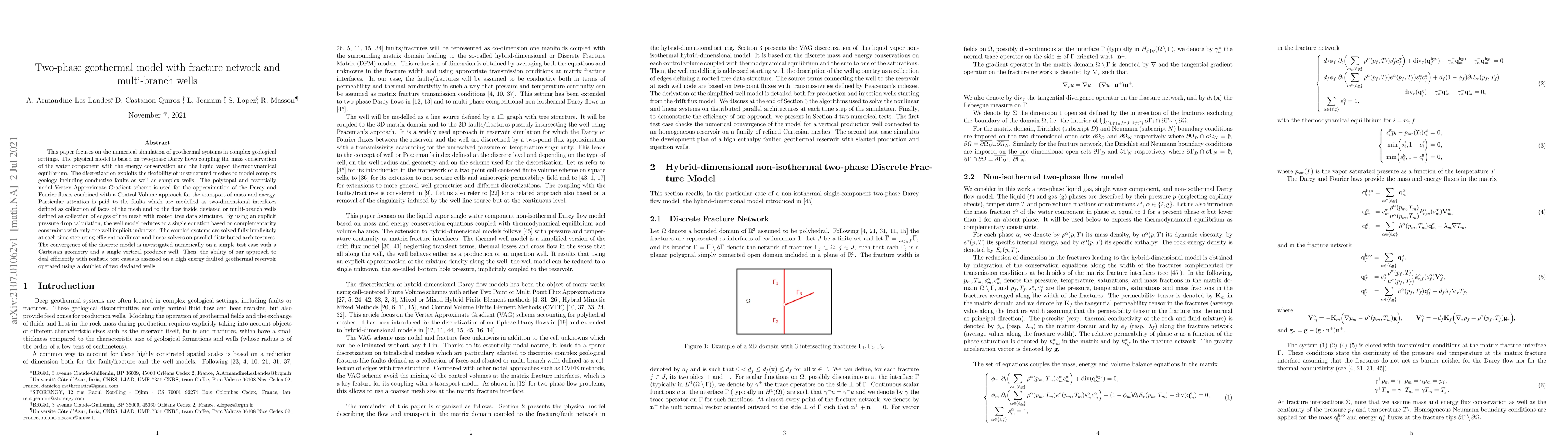 This paper develops a numerical model for geothermal systems with complex geometry, including faults and multi-branch wells, using a two-phase Darcy flow approach. The model demonstrates efficient solution of coupled systems on parallel architectures.