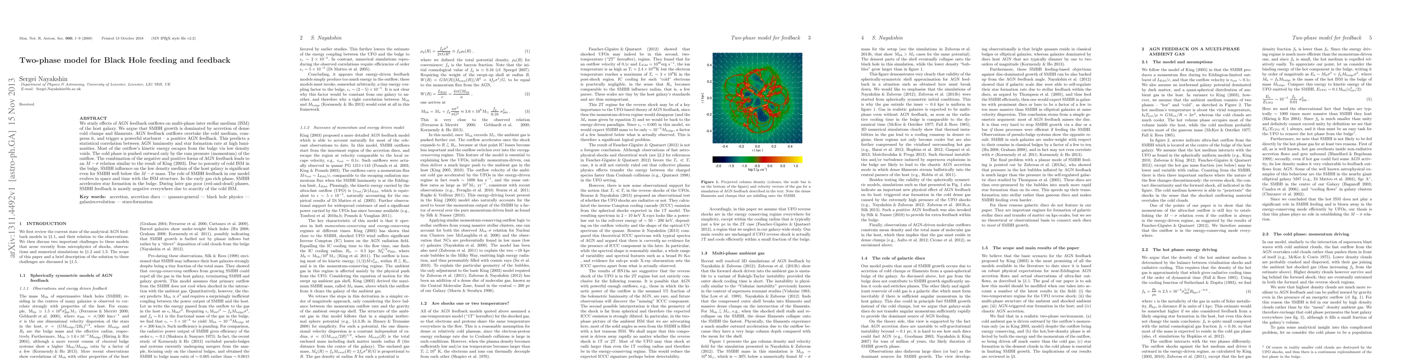 This paper proposes a two-phase model for black hole feeding and feedback, arguing that SMBH growth is driven by dense cold clumps and filaments, while AGN feedback compresses the cold medium, triggering starbursts and influencing star formation rates. The study highlights the complex interplay between negative and positive feedback mechanisms, leading to an $M-\sigma$ relation and significant SMBH influence on the host galaxy's low-density medium.