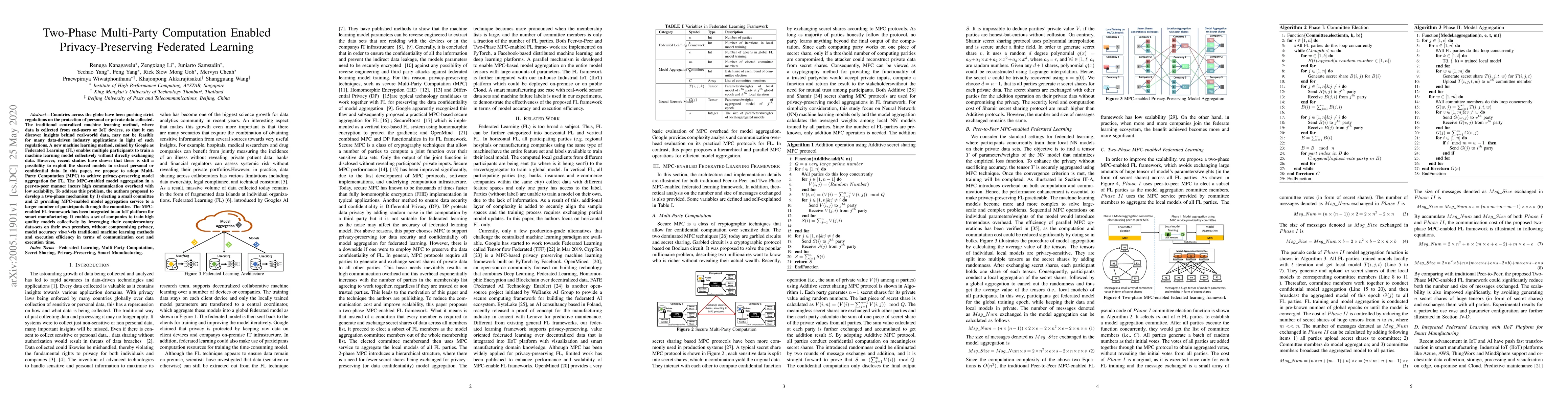 Countries across the globe have been pushing strict regulations on the protection of personal or private data collected. The traditional centralized machine learning method, where data is collected from end-users or IoT devices, so that it can discover insights behind real-world data, may not be feasible for many data-driven industry applications in light of such regulations. A new machine learning method, coined by Google as Federated Learning (FL) enables multiple participants to train a machine learning model collectively without directly exchanging data. However, recent studies have shown that there is still a possibility to exploit the shared models to extract personal or confidential data. In this paper, we propose to adopt Multi Party Computation (MPC) to achieve privacy-preserving model aggregation for FL. The MPC-enabled model aggregation in a peer-to-peer manner incurs high communication overhead with low scalability. To address this problem, the authors proposed to develop a two-phase mechanism by 1) electing a small committee and 2) providing MPC-enabled model aggregation service to a larger number of participants through the committee. The MPC enabled FL framework has been integrated in an IoT platform for smart manufacturing. It enables a set of companies to train high quality models collectively by leveraging their complementary data-sets on their own premises, without compromising privacy, model accuracy vis-a-vis traditional machine learning methods and execution efficiency in terms of communication cost and execution time.