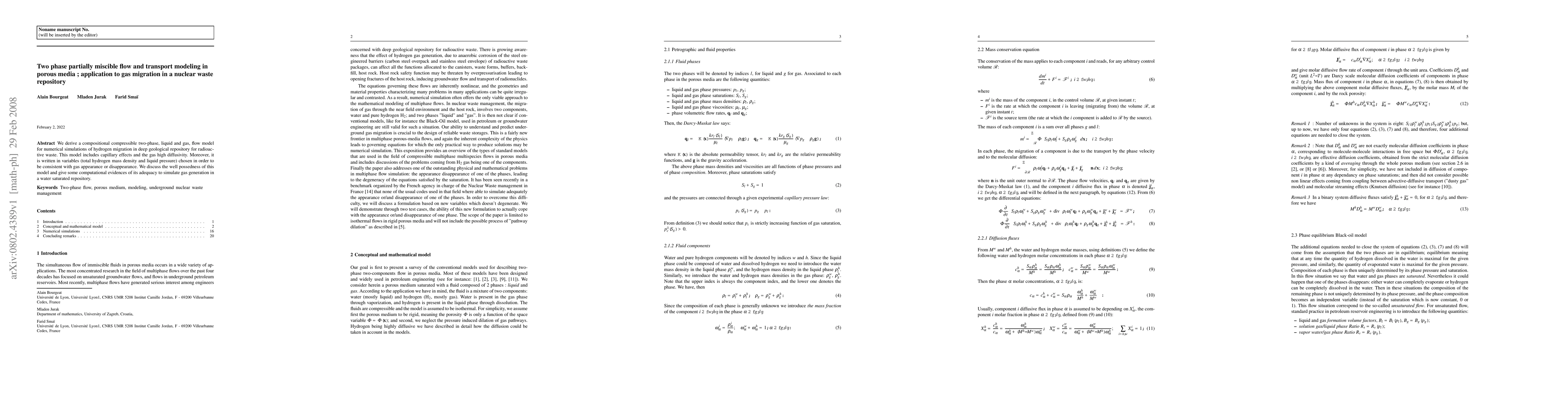 We derive a compositional compressible two-phase, liquid and gas, flow model for numerical simulations of hydrogen migration in deep geological repository for radioactive waste. This model includes capillary effects and the gas high diffusivity. Moreover, it is written in variables (total hydrogen mass density and liquid pressure) chosen in order to be consistent with gas appearance or disappearance. We discuss the well possedness of this model and give some computational evidences of its adequacy to simulate gas generation in a water saturated repository.