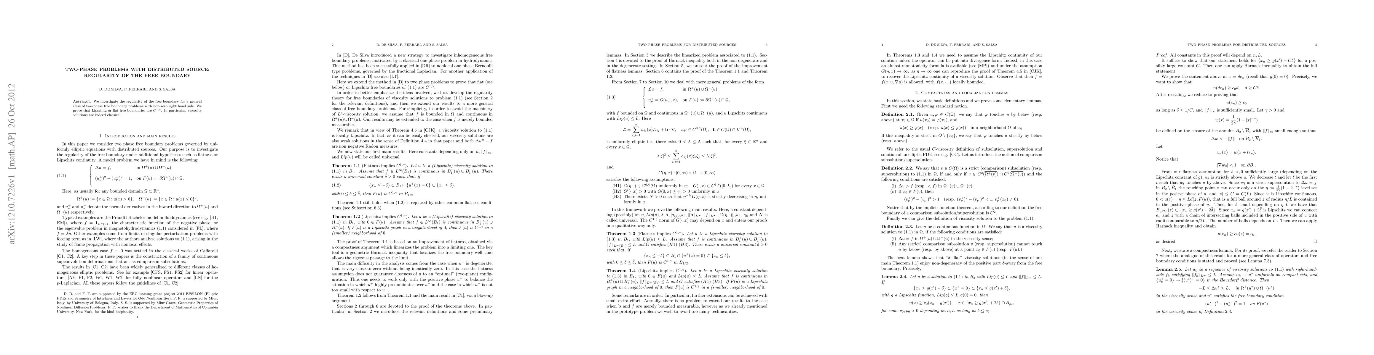 This paper examines the regularity of free boundaries in two-phase problems with distributed sources, proving that Lipschitz or flat free boundaries are $C^{1,\gamma}$ and confirming that viscosity solutions are classical.