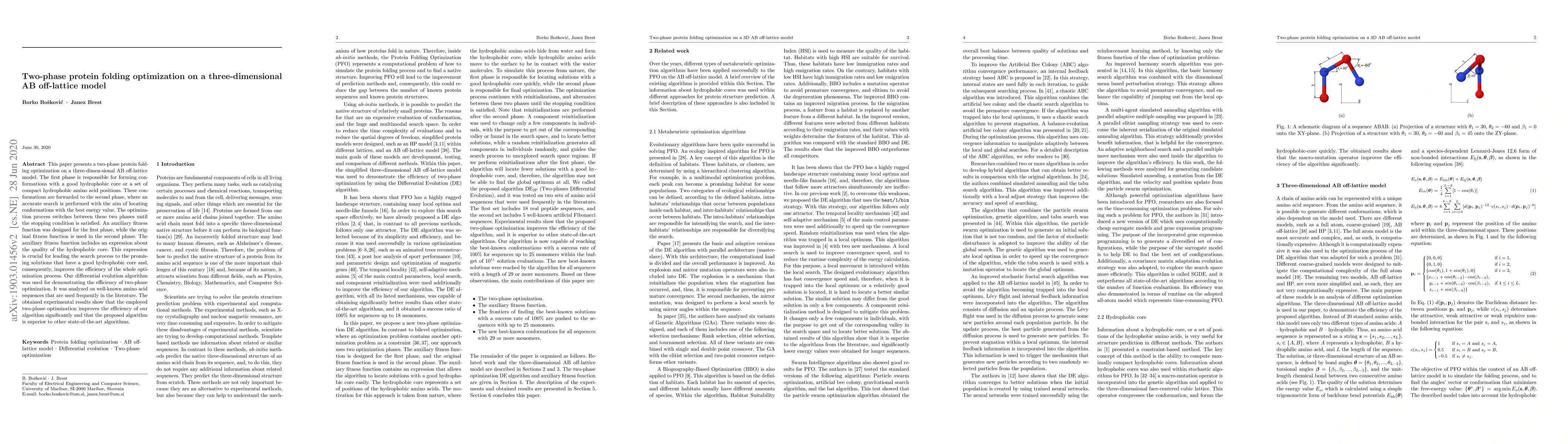 This paper presents a two-phase protein folding optimization on a three-dimensional AB off-lattice model. The first phase is responsible for forming conformations with a good hydrophobic core or a set of compact hydrophobic amino acid positions. These conformations are forwarded to the second phase, where an accurate search is performed with the aim of locating conformations with the best energy value. The optimization process switches between these two phases until the stopping condition is satisfied. An auxiliary fitness function was designed for the first phase, while the original fitness function is used in the second phase. The auxiliary fitness function includes an expression about the quality of the hydrophobic core. This expression is crucial for leading the search process to the promising solutions that have a good hydrophobic core and, consequently, improves the efficiency of the whole optimization process. Our differential evolution algorithm was used for demonstrating the efficiency of two-phase optimization. It was analyzed on well-known amino acid sequences that are used frequently in the literature. The obtained experimental results show that the employed two-phase optimization improves the efficiency of our algorithm significantly and that the proposed algorithm is superior to other state-of-the-art algorithms.