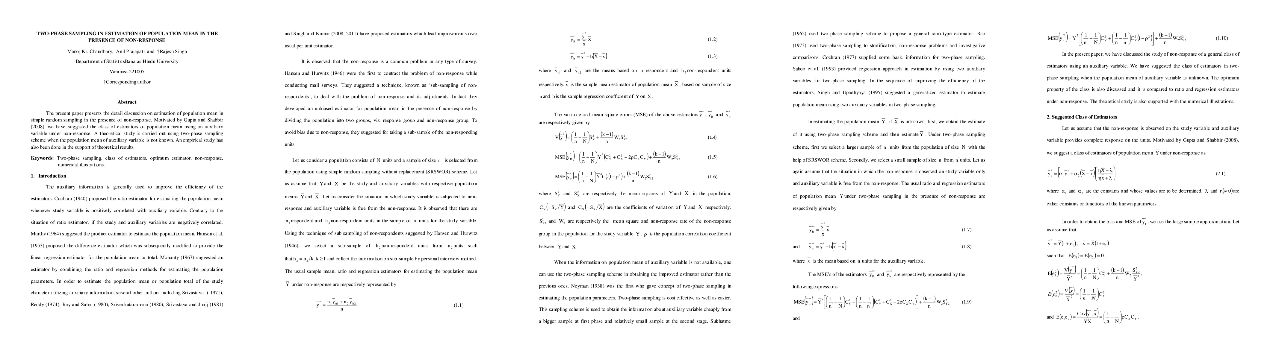 This paper proposes new estimators for the population mean using auxiliary variables under non-response, employing a two-phase sampling scheme when the auxiliary variable's population mean is unknown. An empirical study supports the theoretical findings.