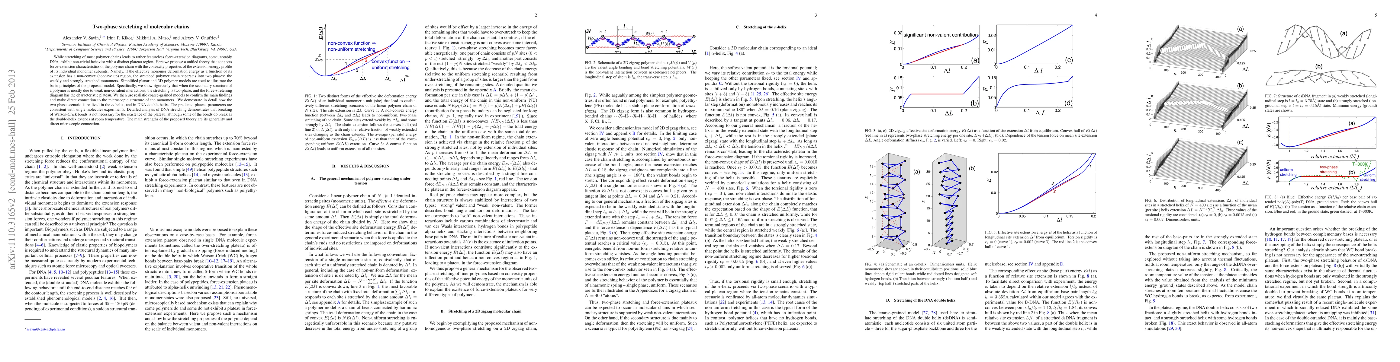 While stretching of most polymer chains leads to rather featureless force-extension diagrams, some, notably DNA, exhibit non-trivial behavior with a distinct plateau region. Here we propose a unified theory that connects force-extension characteristics of the polymer chain with the convexity properties of the extension energy profile of its individual monomer subunits. Namely, if the effective monomer deformation energy as a function of its extension has a non-convex (concave up) region, the stretched polymer chain separates into two phases: the weakly and strongly stretched monomers. Simplified planar and 3D polymer models are used to illustrate the basic principles of the proposed model. Specifically, we show rigorously that when the secondary structure of a polymer is mostly due to weak non-covalent interactions, the stretching is two-phase, and the force-stretching diagram has the characteristic plateau. We then use realistic coarse-grained models to confirm the main findings and make direct connection to the microscopic structure of the monomers. We demostrate in detail how the two-phase scenario is realized in the \alpha-helix, and in DNA double helix. The predicted plateau parameters are consistent with single molecules experiments. Detailed analysis of DNA stretching demonstrates that breaking of Watson-Crick bonds is not necessary for the existence of the plateau, although some of the bonds do break as the double-helix extends at room temperature. The main strengths of the proposed theory are its generality and direct microscopic connection.