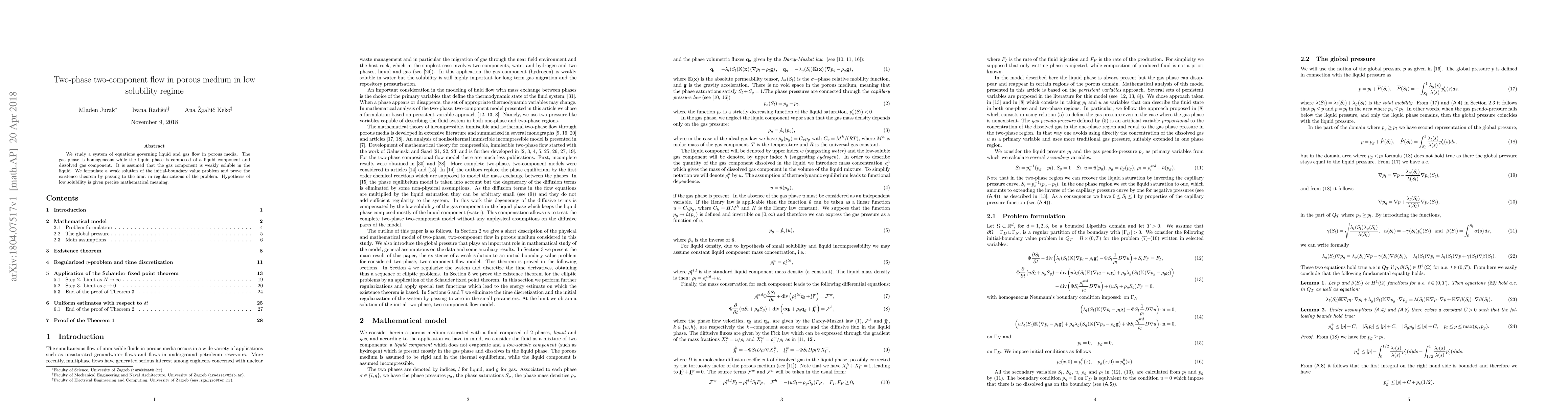 Researchers studied two-phase flow in porous media with low solubility of gas in liquid, proving existence of weak solution to the governing system of equations.