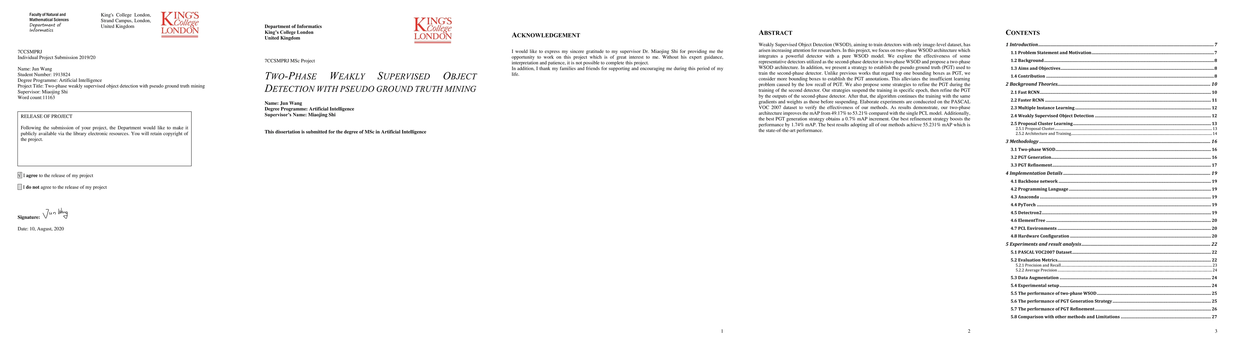Weakly Supervised Object Detection (WSOD), aiming to train detectors with only image-level dataset, has arisen increasing attention for researchers. In this project, we focus on two-phase WSOD architecture which integrates a powerful detector with a pure WSOD model. We explore the effectiveness of some representative detectors utilized as the second-phase detector in two-phase WSOD and propose a two-phase WSOD architecture. In addition, we present a strategy to establish the pseudo ground truth (PGT) used to train the second-phase detector. Unlike previous works that regard top one bounding boxes as PGT, we consider more bounding boxes to establish the PGT annotations. This alleviates the insufficient learning problem caused by the low recall of PGT. We also propose some strategies to refine the PGT during the training of the second detector. Our strategies suspend the training in specific epoch, then refine the PGT by the outputs of the second-phase detector. After that, the algorithm continues the training with the same gradients and weights as those before suspending. Elaborate experiments are conduceted on the PASCAL VOC 2007 dataset to verify the effectiveness of our methods. As results demonstrate, our two-phase architecture improves the mAP from 49.17% to 53.21% compared with the single PCL model. Additionally, the best PGT generation strategy obtains a 0.7% mAP increment. Our best refinement strategy boosts the performance by 1.74% mAP. The best results adopting all of our methods achieve 55.231% mAP which is the state-of-the-art performance.