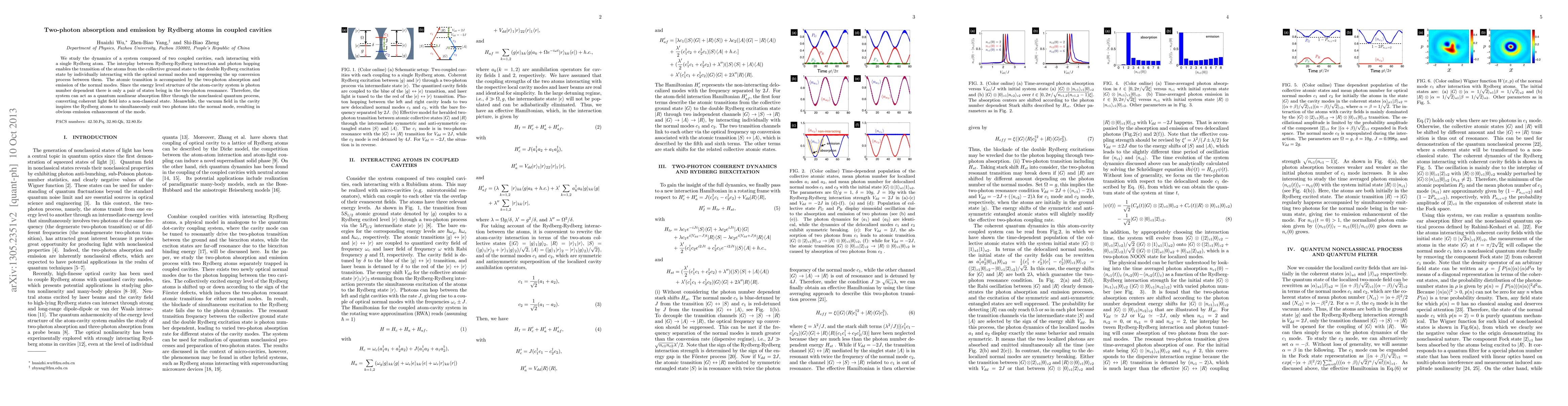We study the dynamics of a system composed of two coupled cavities, each containing a single Rydberg atom. The interplay between Rydberg-Rydberg interaction and photon hopping enables the transition of the atoms from the collective ground state to the double Rydberg excitation state by individually interacting with the hybrid cavity modes and suppressing the up conversion process between them. The atomic transition is accompanied by the two-photon absorption and emission of the hybrid modes. Since the energy level structure of the atom-cavity system is photon number dependent, there is only a pair of states being in the two-photon resonance. Therefore, the system can act as a quantum nonlinear absorption filter through the nonclassical quantum process, converting coherent light field into a non-classical state. Meanwhile, the vacuum field in the cavity inspires the Rydberg atoms to simultaneously emit two photons into the hybrid mode, resulting in obvious emission enhancement of the mode.