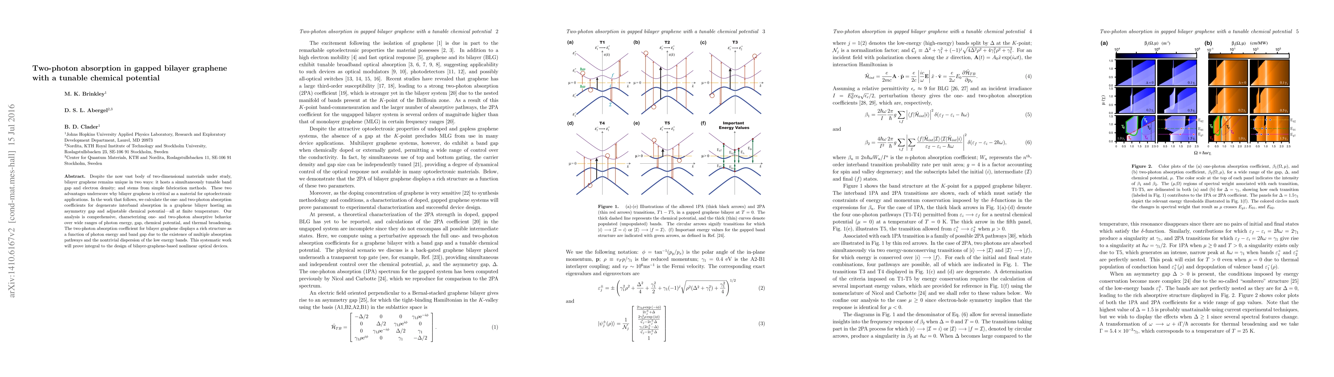 This paper investigates the two-photon absorption in bilayer graphene with a tunable band gap and chemical potential, revealing complex absorptive behavior influenced by photon energy and band gap. The findings provide essential insights for developing nonlinear optical devices based on bilayer graphene.