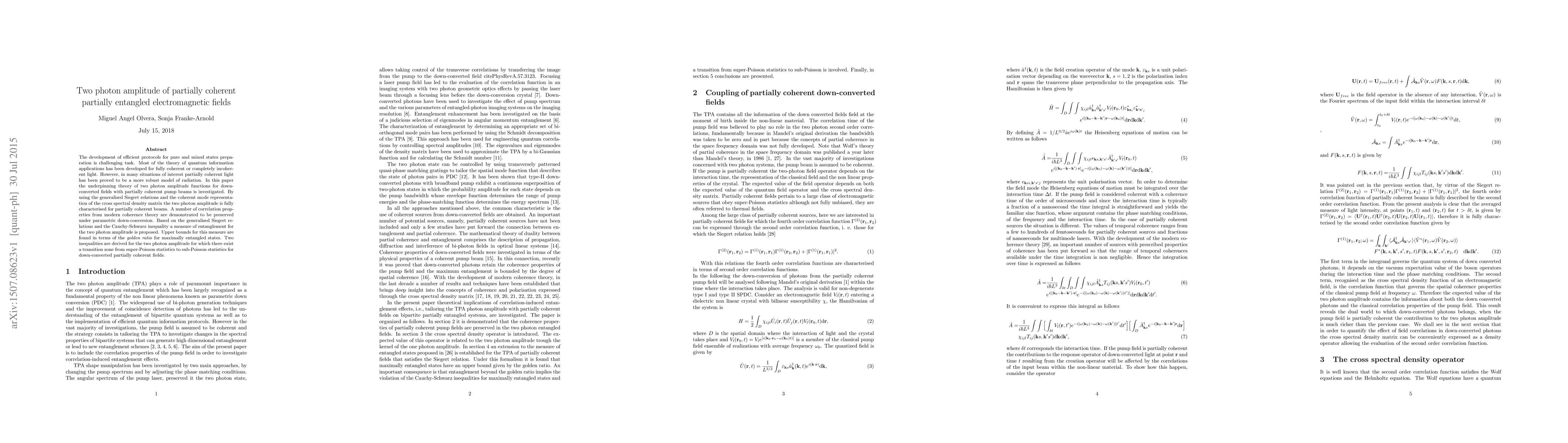 This paper investigates the two-photon amplitude functions for partially coherent and partially entangled electromagnetic fields generated through parametric down-conversion. It characterizes the two-photon amplitude using generalized Siegert relations and proposes a measure of entanglement for these fields, finding upper bounds related to the golden ratio for maximally entangled states.