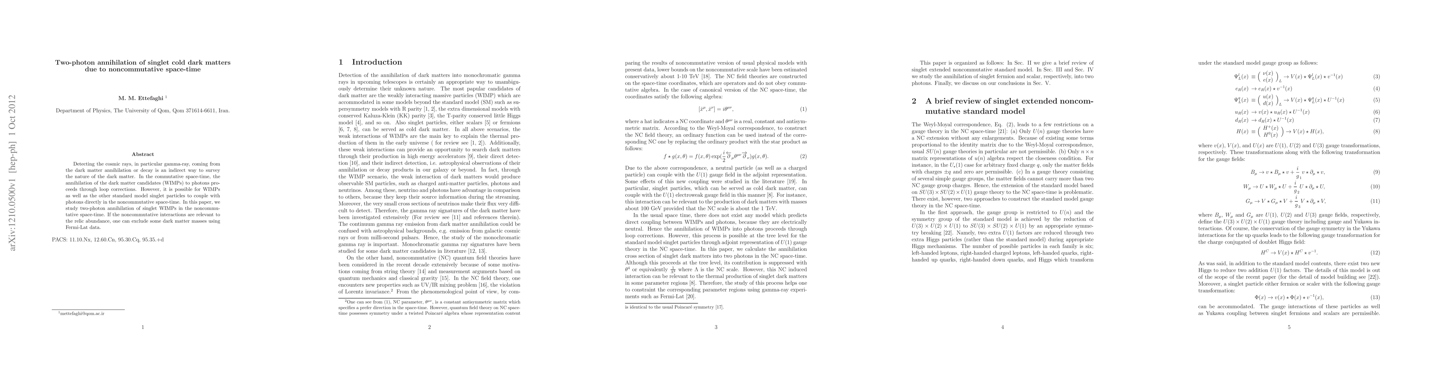 This paper explores the two-photon annihilation of singlet cold dark matter particles, specifically Weakly Interacting Massive Particles (WIMPs), in a noncommutative space-time framework. It suggests that noncommutative interactions could provide a direct coupling between WIMPs and photons, potentially explaining gamma-ray cosmic rays and allowing for exclusions of certain dark matter masses based on Fermi-Lat data.