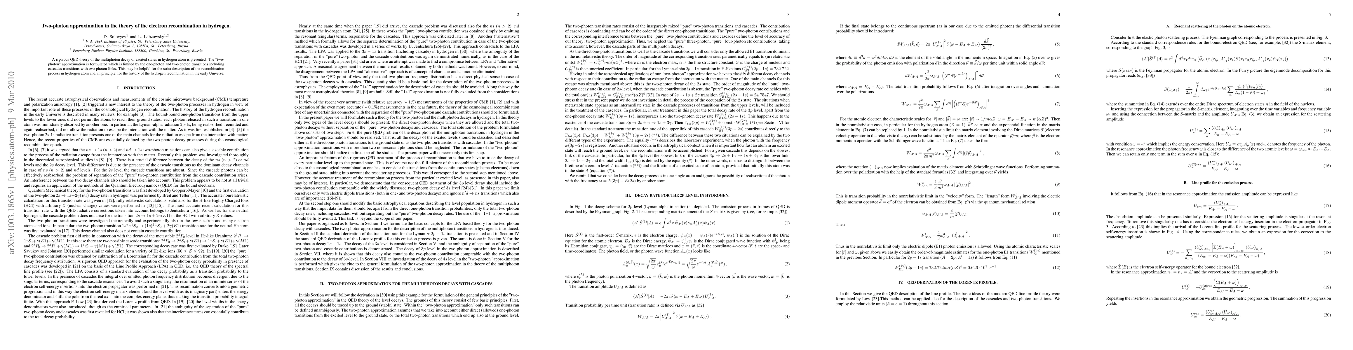 This paper presents a rigorous QED theory for multiphoton decay in hydrogen atoms, formulating a "two-photon" approximation that considers both one-photon and two-photon transitions, including cascades. This approach aids in accurately describing electron recombination in hydrogen and may contribute to understanding hydrogen recombination in the early Universe.