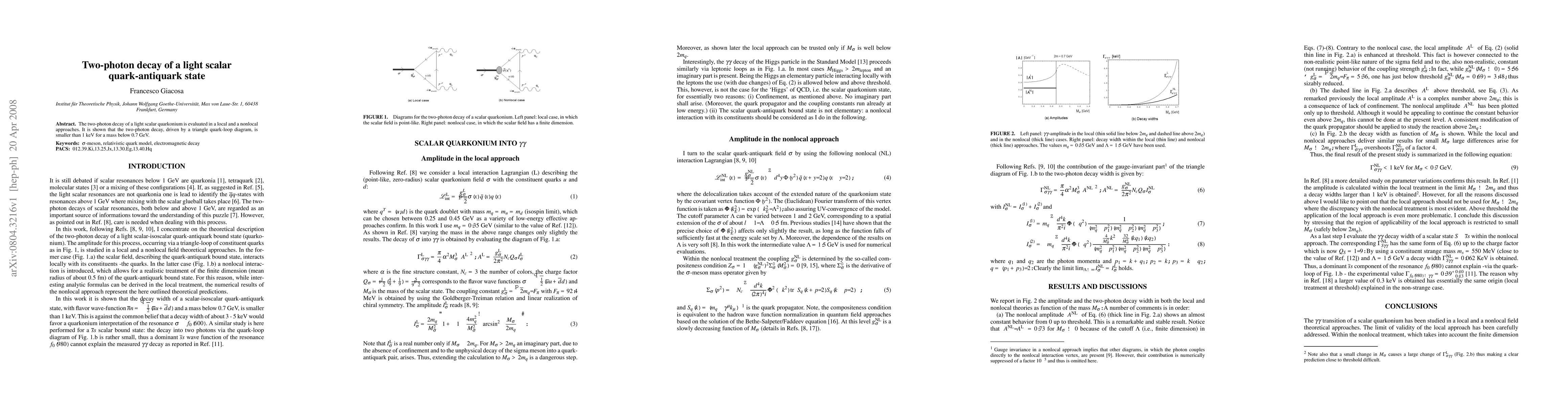 Researchers studied the two-photon decay of a light scalar quark-antiquark state, finding it's smaller than 1 keV for masses below 0.7 GeV.