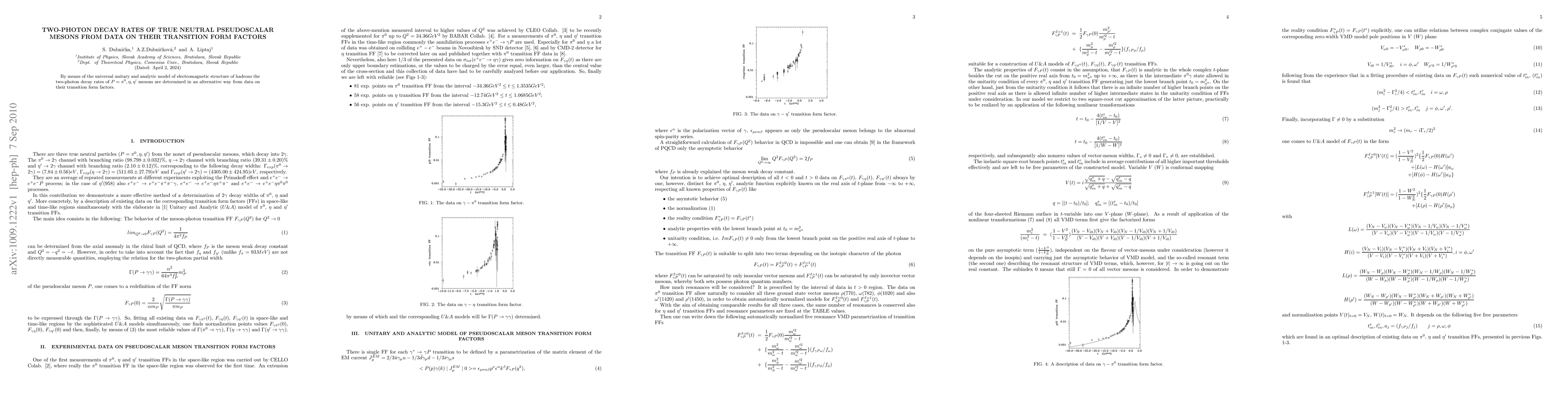 By means of the universal unitary and analytic model of electromagnetic structure of hadrons the two-photon decay rates of P=pi^0, eta, eta' mesons are determined in an alternative way from data on their transition form factors.