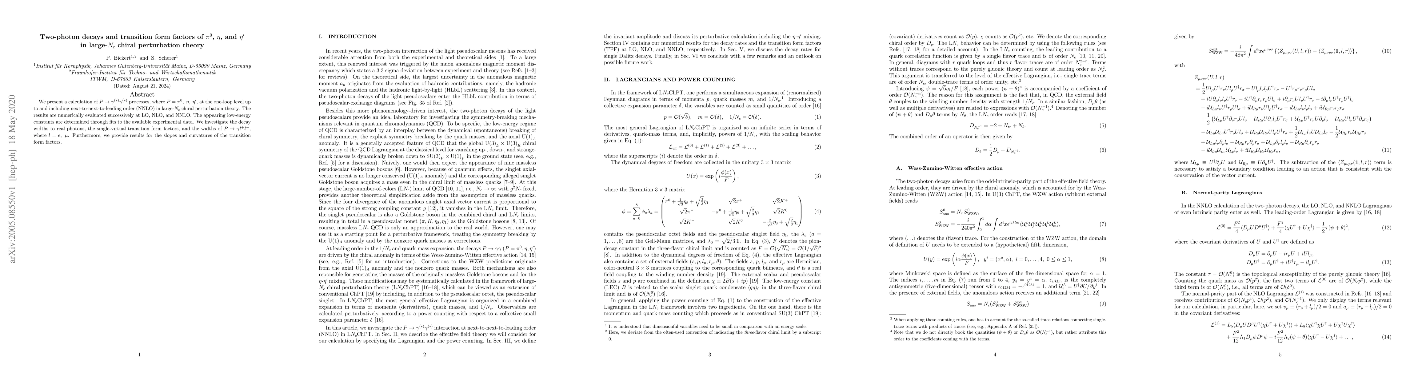 This paper calculates two-photon decays and transition form factors for $\pi^0$, $\eta$, and $\eta'$ mesons using large-$N_c$ chiral perturbation theory up to NNLO. The study evaluates decay widths, transition form factors, and leptonic decay widths, with low-energy constants fitted to experimental data.