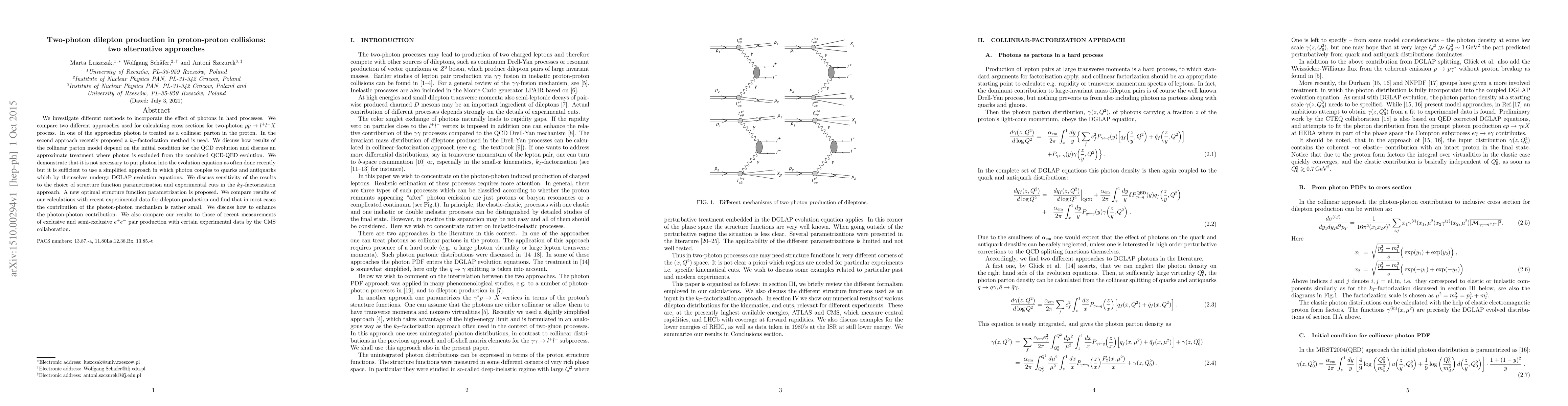We investigate different methods to incorporate the effect of photons in hard processes. We compare two different approaches used for calculating cross sections for two-photon $p p \to l^+ l^- X$ process. In one of the approaches photon is treated as a collinear parton in the proton. In the second approach recently proposed a $k_T$-factorization method is used. We discuss how results of the collinear parton model depend on the initial condition for the QCD evolution and discuss an approximate treatment where photon is excluded from the combined QCD-QED evolution. We demonstrate that it is not necessary to put photon into the evolution equation as often done recently but it is sufficient to use a simplified approach in which photon couples to quarks and antiquarks which by themselves undergo DGLAP evolution equations. We discuss sensitivity of the results to the choice of structure function parametrization and experimental cuts in the $k_T$-factorization approach. A new optimal structure function parametrization is proposed. We compare results of our calculations with recent experimental data for dilepton production and find that in most cases the contribution of the photon-photon mechanism is rather small. We discuss how to enhance the photon-photon contribution. We also compare our results to those of recent measurements of exclusive and semi-exclusive $e^+ e^-$ pair production with certain experimental data by the CMS collaboration.
