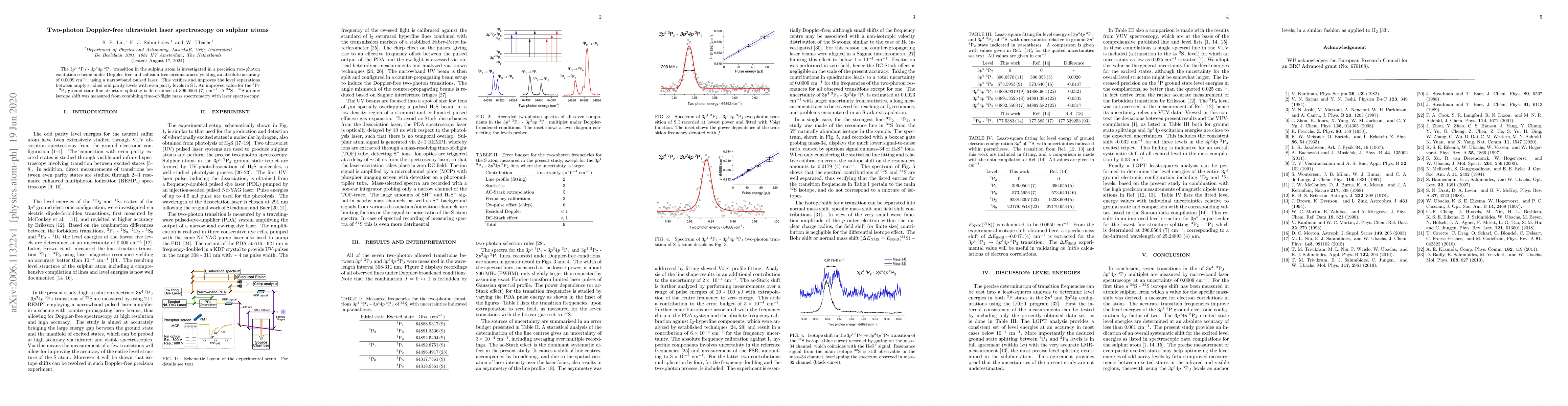 The $3p^{4}$ $^{3}$P$_{J}$ - $3p^{3}4p$ $^{3}$P$_{J}$ transition in the sulphur atom is investigated in a precision two-photon excitation scheme under Doppler-free and collision-free circumstances yielding an absolute accuracy of 0.0009 cm$^{-1}$, using a narrowband pulsed laser. This verifies and improves the level separations between amply studied odd parity levels with even parity levels in S I. An improved value for the $^{3}$P$_{2}$ - $^{3}$P$_{1}$ ground state fine structure splitting is determined at $396.0564$ (7) cm$^{-1}$. A $^{34}$S - $^{32}$S atomic isotope shift was measured from combining time-of-flight mass spectrometry with laser spectroscopy.
