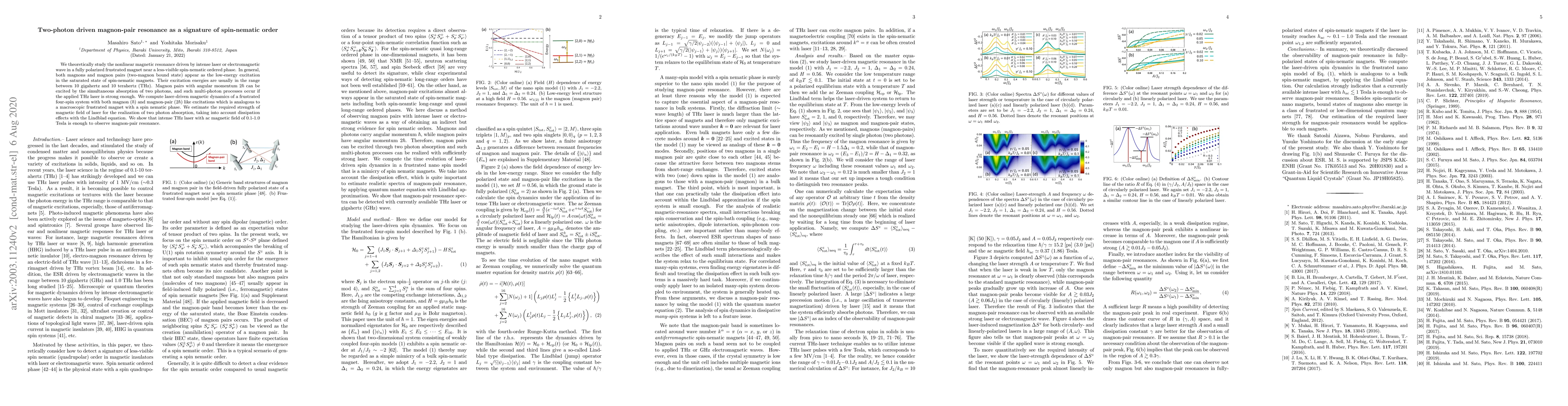 We theoretically study the nonlinear magnetic resonance driven by intense laser or electromagnetic wave in a fully polarized frustrated magnet near a less-visible spin-nematic ordered phase. In general, both magnons and magnon pairs (two-magnon bound state) appear as the low-energy excitation in the saturated state of spin-nematic magnets. Their excitation energies are usually in terahertz (THz) or gigahertz range. Magnon pairs with angular momentum 2$\hbar$ can be excited by the simultaneous absorption of two photons, and such multi-photon processes occur if the applied THz laser is strong enough. We compute laser-driven magnetic dynamics of a frustrated four-spin system with both magnon ($\hbar$) and magnon-pair (2$\hbar$) like excitations which is analogous to a macroscopic frustrated magnet with a spin nematic phase. We estimate the required strength of magnetic field of laser for the realization of two photon absorption, taking into account dissipation effects with the Lindblad equation. We show that intense THz laser with ac magnetic field of 0.1-1.0 Tesla is enough to observe magnon-pair resonance.