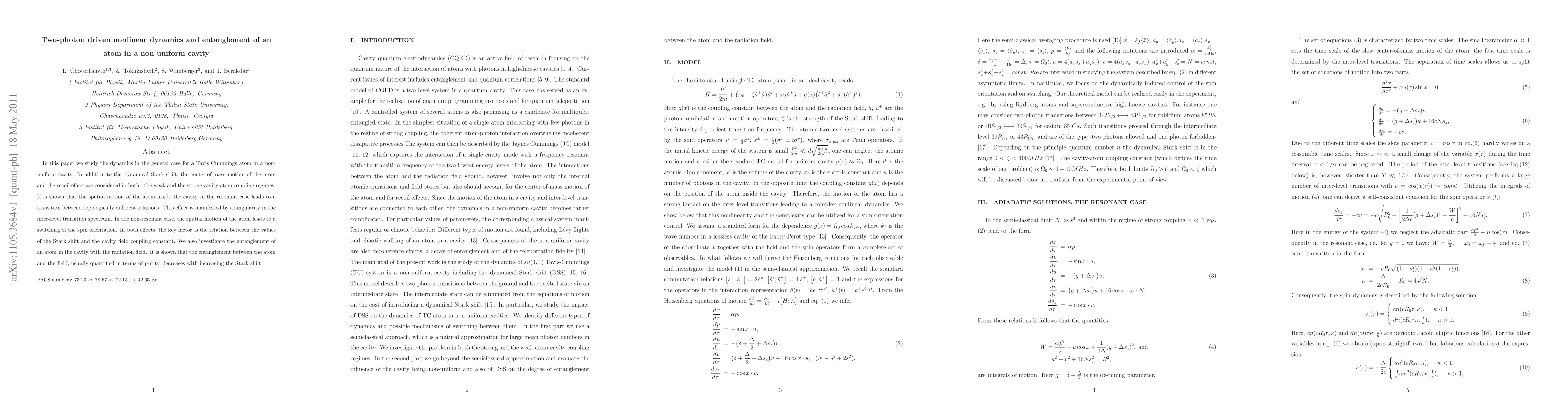 In this paper we study the dynamics in the general case for a Tavis Cummings atom in a non-uniform cavity. In addition to the dynamical Stark shift, the center-of-mass motion of the atom and the recoil effect are considered in both - the weak and the strong cavity atom coupling regimes. It is shown that the spatial motion of the atom inside the cavity in the resonant case leads to a transition between topologically different solutions. This effect is manifested by a singularity in the inter-level transition spectrum. In the non-resonant case, the spatial motion of the atom leads to a switching of the spin orientation. In both effects, the key factor is the relation between the values of the Stark shift and the cavity field coupling constant. We also investigate the entanglement of an atom in the cavity with the radiation field. It is shown that the entanglement between the atom and the field, usually quantified in terms of purity, decreases with increasing the Stark shift.