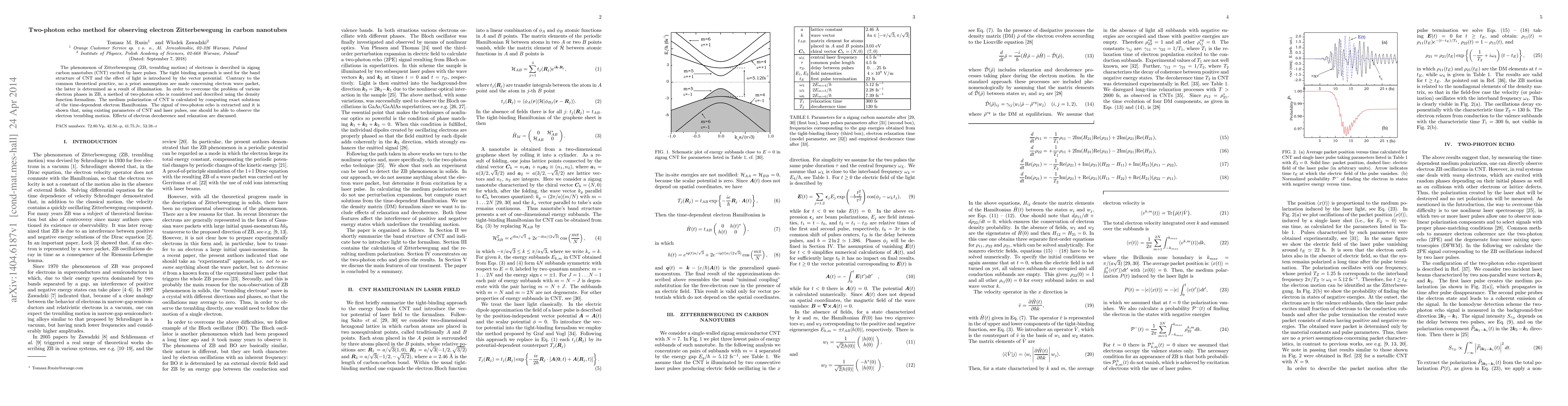 This paper investigates the phenomenon of Zitterbewegung in zigzag carbon nanotubes using a two-photon echo method, observing electron motion without prior assumptions about the wave packet. The study employs tight-binding and vector potential approaches, and suggests that existing parameters could allow for the observation of electron trembling motion despite decoherence and relaxation effects.