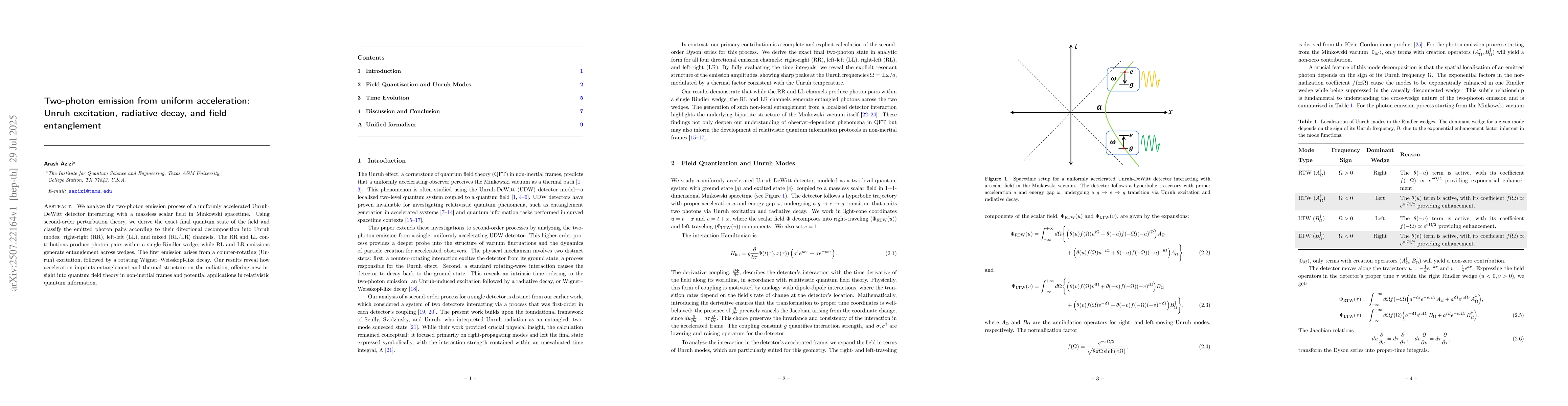 We analyze the two-photon emission process of a uniformly accelerated Unruh-DeWitt detector interacting with a massless scalar field in Minkowski spacetime. Using second-order perturbation theory, we derive the exact final quantum state of the field and classify the emitted photon pairs according to their directional decomposition into Unruh modes: right-right (RR), left-left (LL), and mixed (RL/LR) channels. The RR and LL contributions produce photon pairs within a single Rindler wedge, while RL and LR emissions generate entanglement across wedges. The first emission arises from a counter-rotating (Unruh) excitation, followed by a rotating Wigner-Weisskopf-like decay. Our results reveal how acceleration imprints entanglement and thermal structure on the radiation, offering new insight into quantum field theory in non-inertial frames and potential applications in relativistic quantum information.