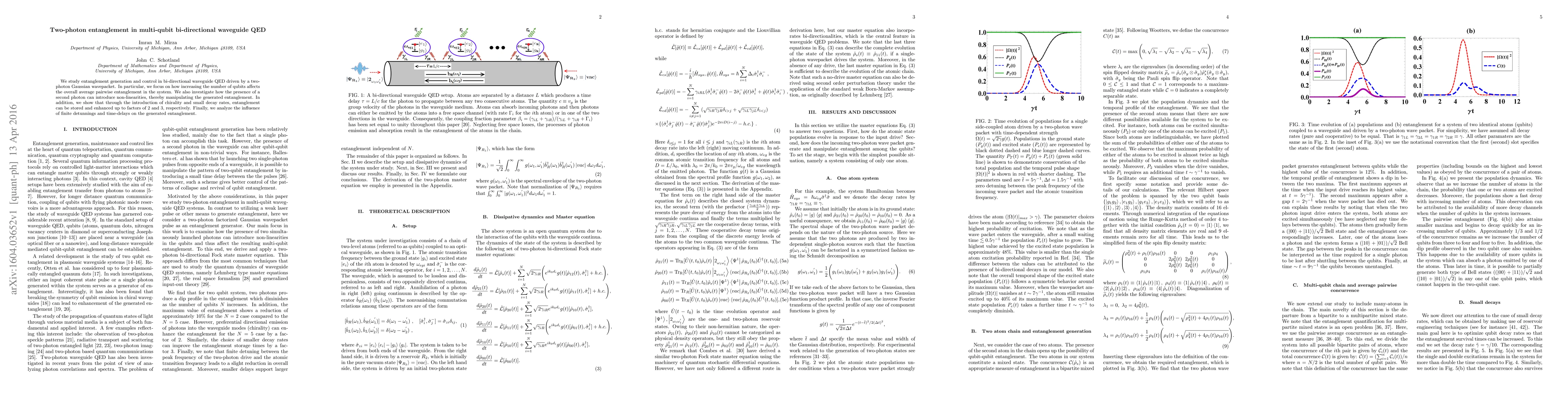We study entanglement generation and control in bi-directional waveguide QED driven by a two photon Gaussian wavepacket. In particular, we focus on how increasing the number of qubits affects the overall average pairwise entanglement in the system. We also investigate how the presence of a second photon can introduce non-linearities, thereby manipulating the generated entanglement. In addition, we show that through the introduction of chirality and small decay rates, entanglement can be stored and enhanced up to factors of 2 and 3, respectively. Finally, we analyze the influence of finite detunnings and time-delays on the generated entanglement.
