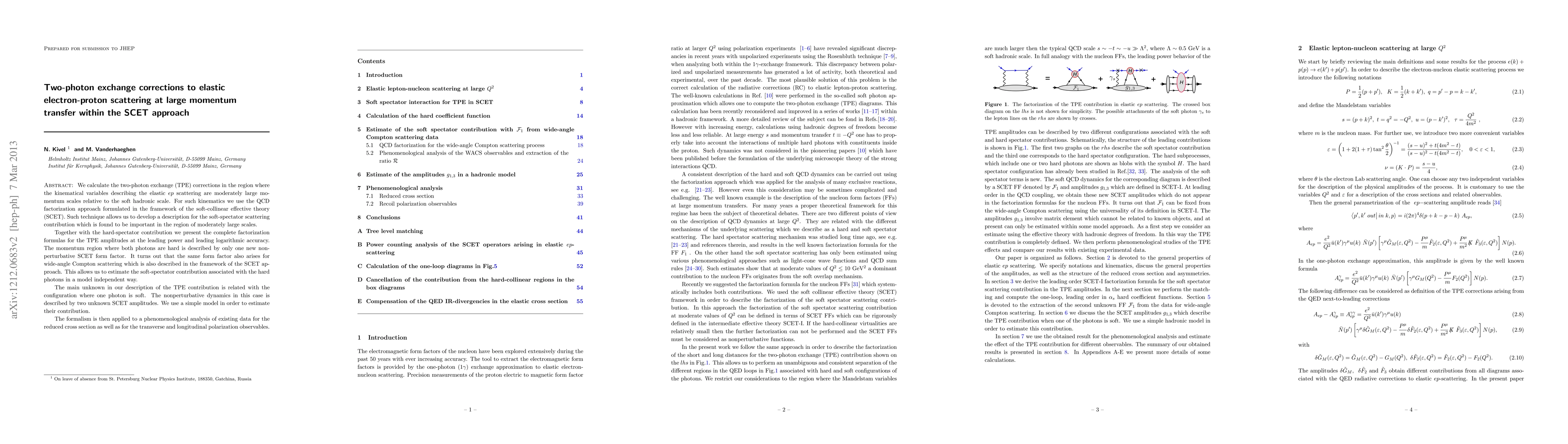 We calculate the two-photon exchange (TPE) corrections in the region where the kinematical variables describing the elastic $ep$ scattering are moderately large momentum scales relative to the soft hadronic scale. For such kinematics we use the QCD factorization approach formulated in the framework of the soft-collinear effective theory (SCET). Such technique allows us to develop a description for the soft-spectator scattering contribution which is found to be important in the region of moderately large scales. Together with the hard-spectator contribution we present the complete factorization formulas for the TPE amplitudes at the leading power and leading logarithmic accuracy. The momentum region where both photons are hard is described by only one new nonperturbative SCET form factor. It turns out that the same form factor also arises for wide-angle Compton scattering which is also described in the framework of the SCET approach. This allows us to estimate the soft-spectator contribution associated with the hard photons in a model independent way. The main unknown in our description of the TPE contribution is related with the configuration where one photon is soft. The nonperturbative dynamics in this case is described by two unknown SCET amplitudes. We use a simple model in order to estimate their contribution. The formalism is then applied to a phenomenological analysis of existing data for the reduced cross section as well as for the transverse and longitudinal polarization observables.