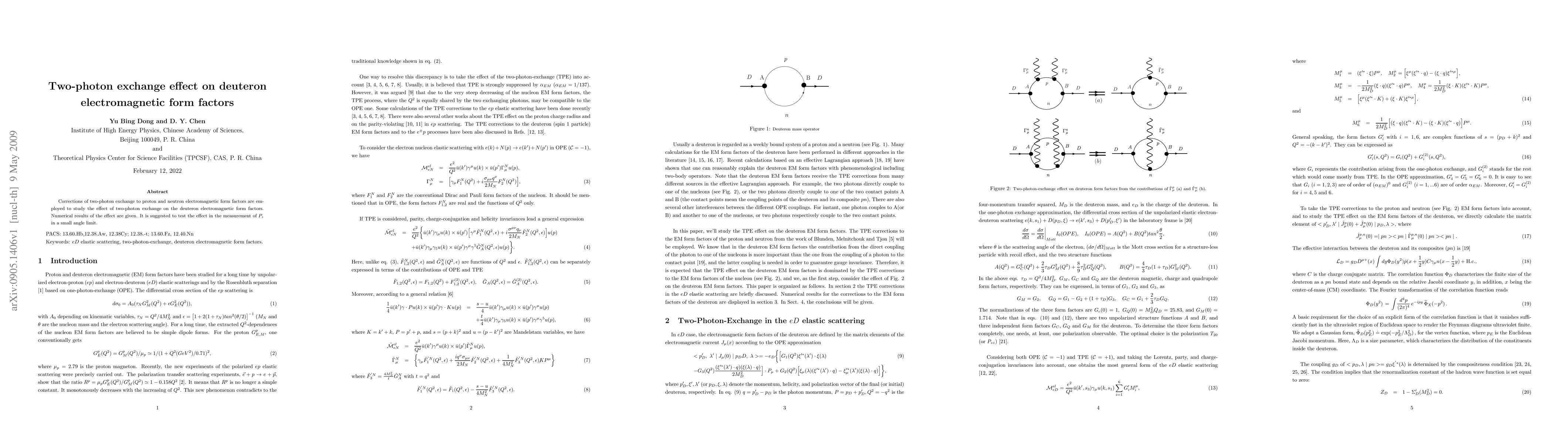 This paper investigates the impact of two-photon exchange on deuteron electromagnetic form factors by analyzing corrections to proton and neutron form factors. It proposes testing this effect through measurements of $P_z$ in the small angle limit.