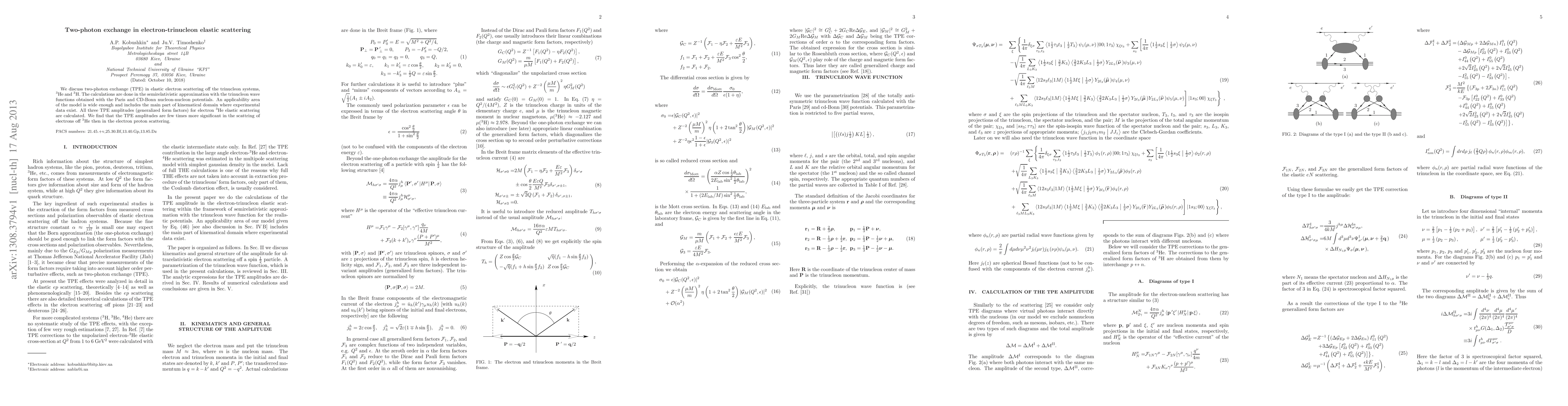 We discuss two-photon exchange (TPE) in elastic electron scattering off the trinucleon systems, 3He and 3H. The calculations are done in the semirelativistic approximation with the trinucleon wave functions obtained with the Paris and CD-Bonn nucleon-nucleon potentials. An applicability area of the model is wide enough and includes the main part of kinematical domain where experimental data exist. All three TPE amplitudes (generalized form factors) for electron 3He elastic scattering are calculated. We find that the TPE amplitudes are few times more significant in the scattring of electrons off 3He then in the electron proton scattering.