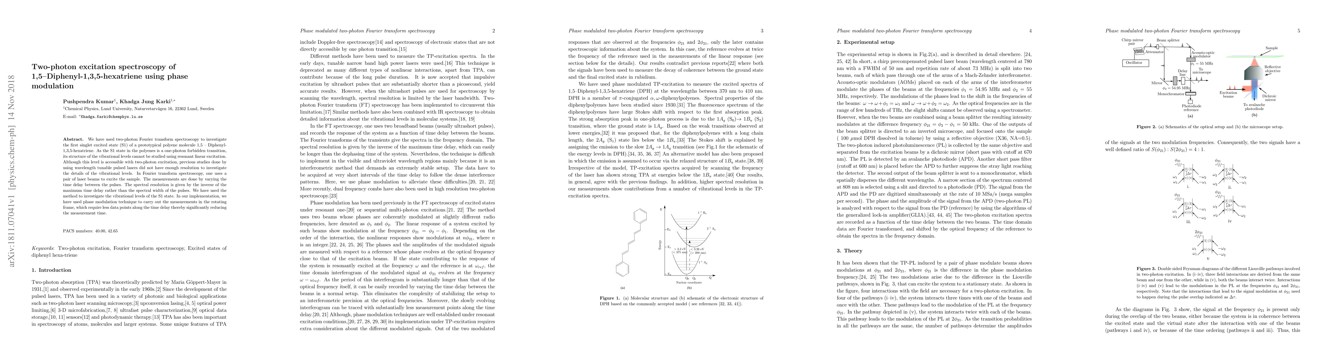 We have used two-photon Fourier transform spectroscopy to investigate the first singlet excited state (S1) of a prototypical polyene molecule 1,5 -- Diphenyl-1,3,5-hexatriene. As the S1 state in the polyenes is a one-photon forbidden transition, its structure of the vibrational levels cannot be studied using resonant linear excitation. Although this level is accessible with two-photon excitation, previous studies done by using wavelength tunable pulsed lasers did not have enough resolution to investigate the details of the vibrational levels. In Fourier transform spectroscopy, one uses a pair of laser beams to excite the sample. The measurements are done by varying the time delay between the pulses. The spectral resolution is given by the inverse of the maximum time delay rather than the spectral width of the pulses. We have used the method to investigate the vibrational levels of the S1 state. In our implementation, we have used a phase modulation technique to carry out the measurements in the rotating frame, which require fewer data points along the time delay thereby significantly reducing the measurement time.