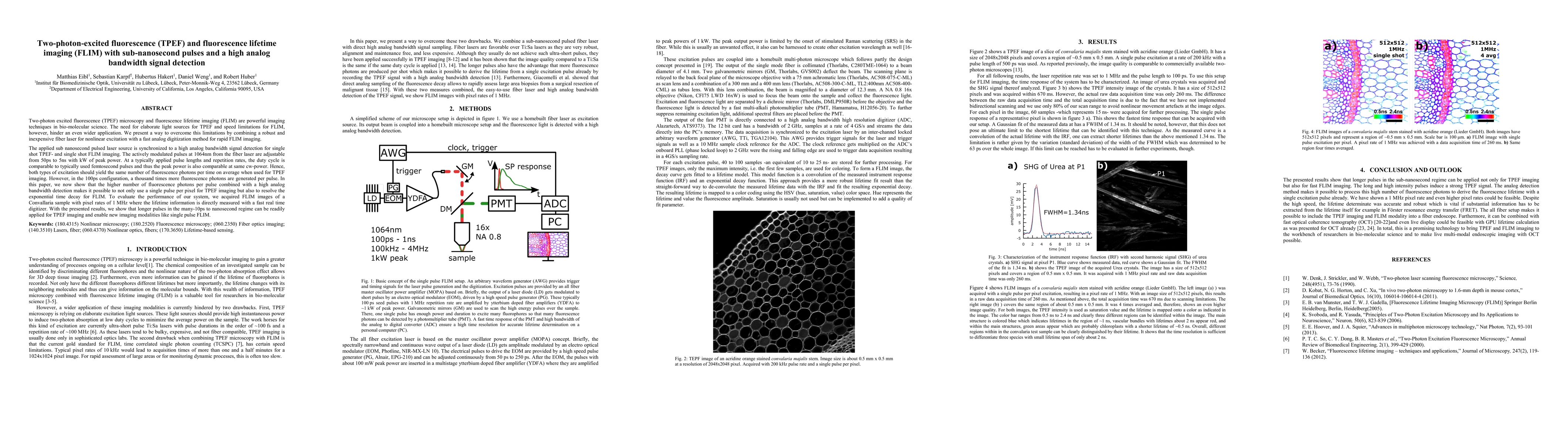 This paper presents a method to enhance two-photon excited fluorescence (TPEF) and fluorescence lifetime imaging (FLIM) using a robust fiber laser for nonlinear excitation and high analog bandwidth signal detection. The system enables single-shot TPEF and FLIM imaging with sub-nanosecond pulses, significantly improving imaging speed and efficiency.