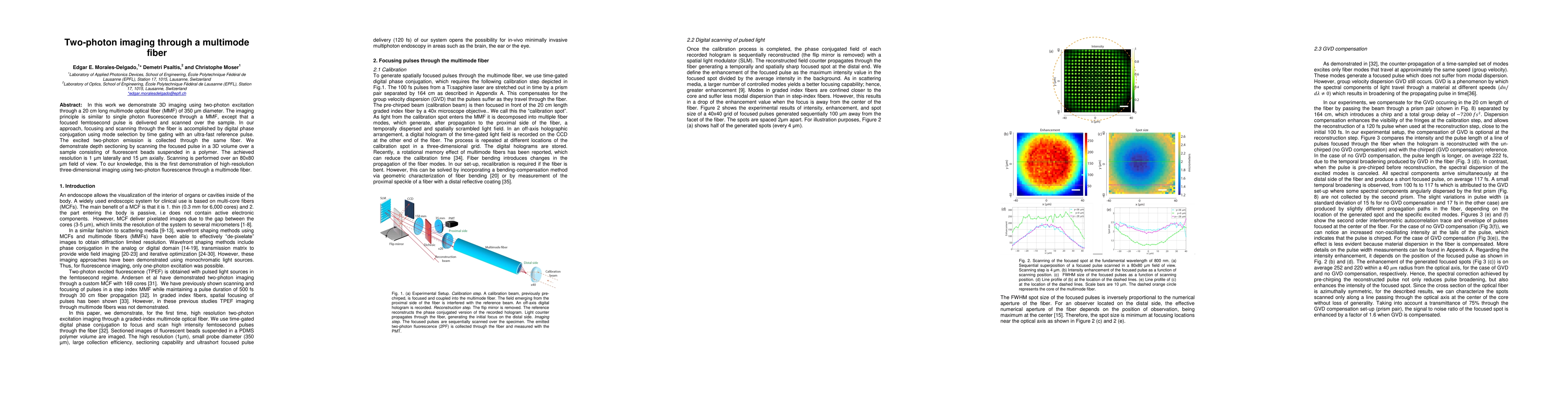 This research demonstrates high-resolution 3D imaging using two-photon excitation through a 20 cm multimode fiber, achieving 1 µm lateral and 15 µm axial resolution. Digital phase conjugation and mode selection enable scanning, marking the first such high-resolution imaging through a multimode fiber.