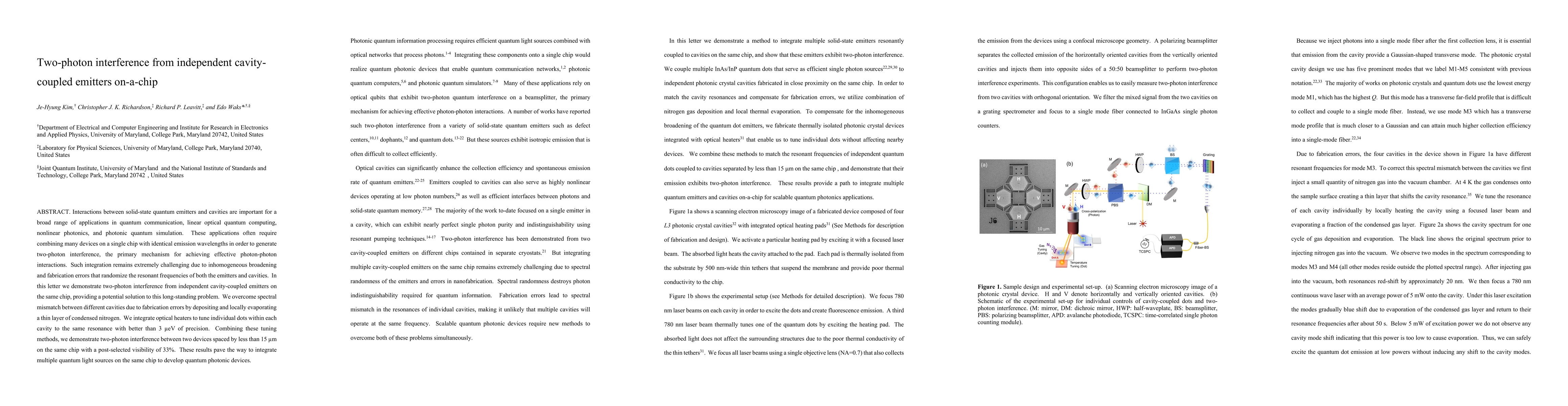 Interactions between solid-state quantum emitters and cavities are important for a broad range of applications in quantum communication, linear optical quantum computing, nonlinear photonics, and photonic quantum simulation. These applications often require combining many devices on a single chip with identical emission wavelengths in order to generate two-photon interference, the primary mechanism for achieving effective photon-photon interactions. Such integration remains extremely challenging due to inhomogeneous broadening and fabrication errors that randomize the resonant frequencies of both the emitters and cavities. In this letter we demonstrate two-photon interference from independent cavity-coupled emitters on the same chip, providing a potential solution to this long-standing problem. We overcome spectral mismatch between different cavities due to fabrication errors by depositing and locally evaporating a thin layer of condensed nitrogen. We integrate optical heaters to tune individual dots within each cavity to the same resonance with better than 3 {\mu}eV of precision. Combining these tuning methods, we demonstrate two-photon interference between two devices spaced by less than 15 {\mu}m on the same chip with a post-selected visibility of 33%. These results pave the way to integrate multiple quantum light sources on the same chip to develop quantum photonic devices.