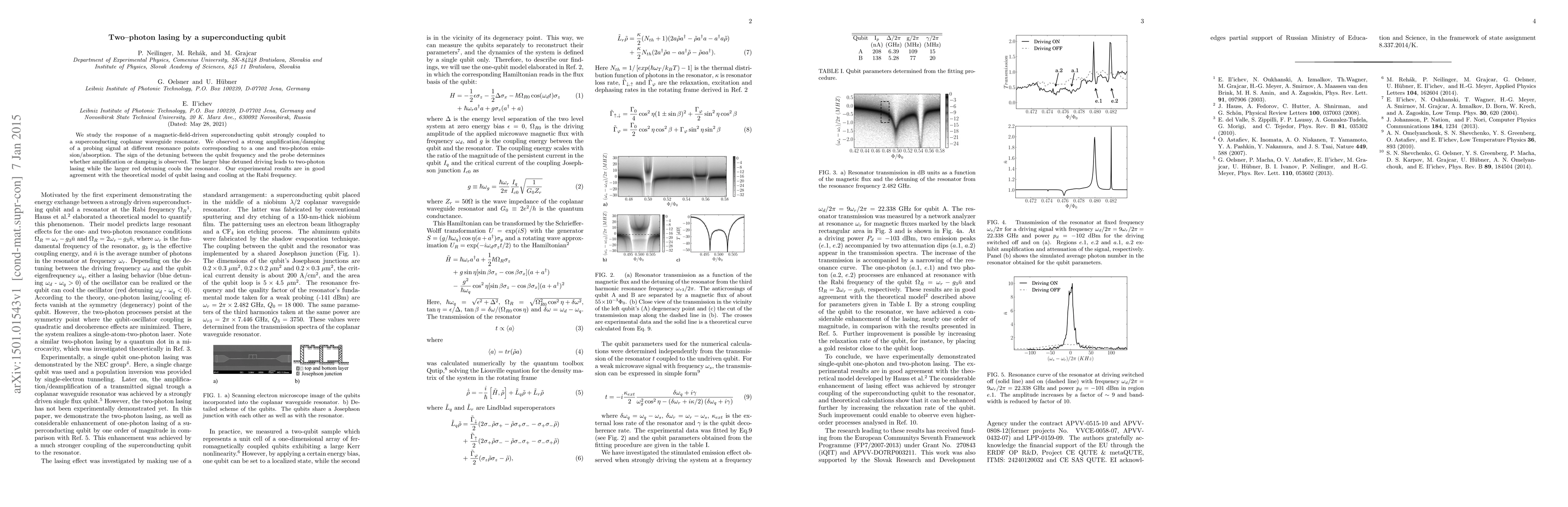 This paper investigates a superconducting qubit strongly coupled to a resonator, observing amplification or damping of probing signals at resonance points corresponding to one and two-photon processes. Two-photon lasing occurs under larger blue detuning, while red detuning cools the resonator, with experimental results aligning well with theoretical models.