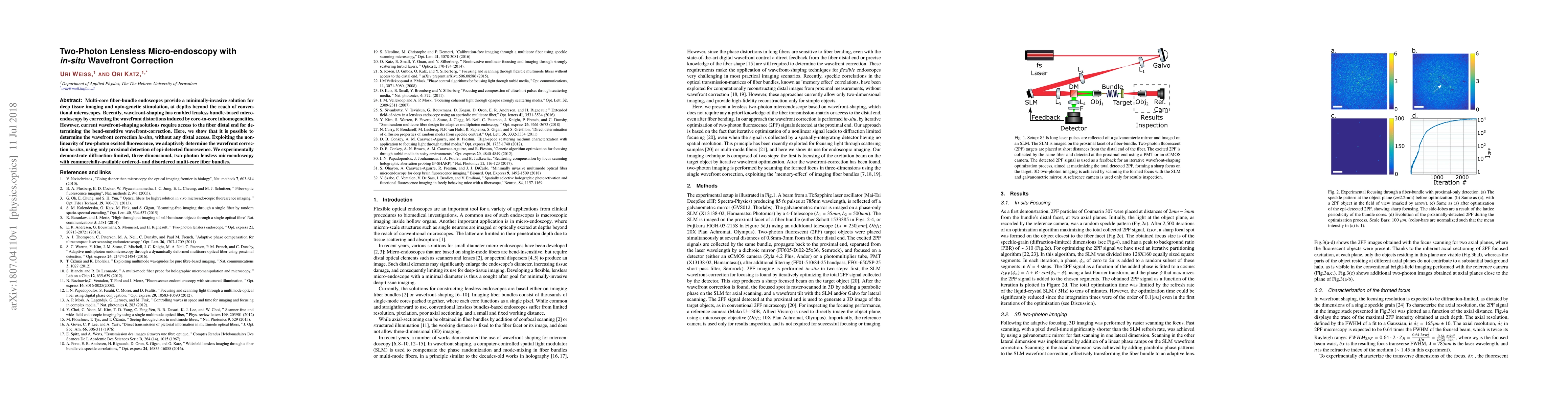 This paper presents a novel method for lensless micro-endoscopy using two-photon excitation, enabling in-situ wavefront correction without requiring access to the fiber distal end. The adaptive correction is achieved through the nonlinearity of two-photon excited fluorescence, demonstrating diffraction-limited, three-dimensional imaging.