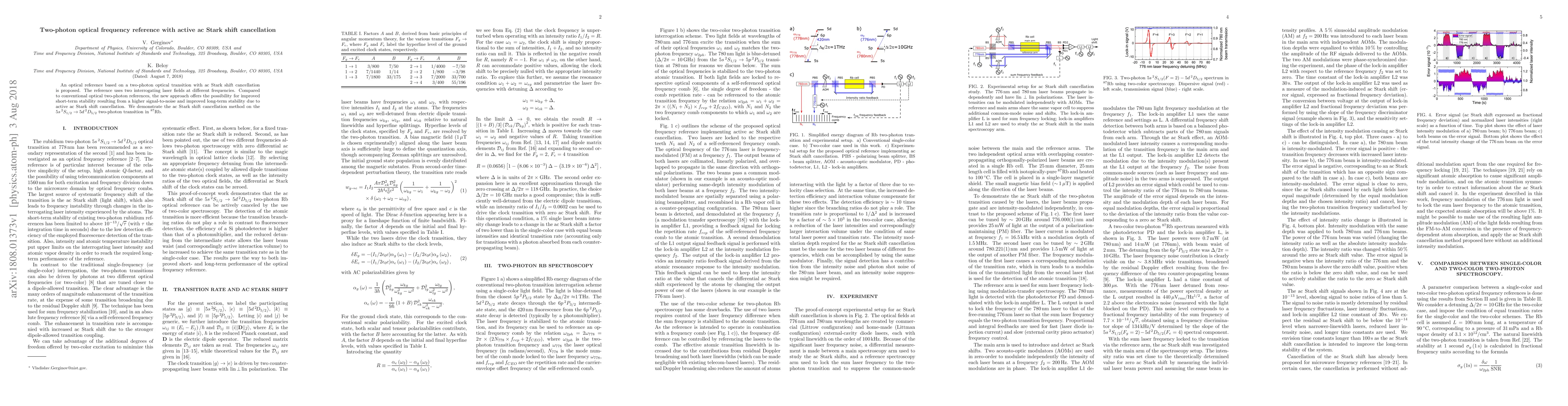 An optical reference based on a two-photon optical transition with ac Stark shift cancellation is proposed. The reference uses two interrogating laser fields at different frequencies. Compared to conventional optical two-photon references, the new approach offers the possibility for improved short-term stability resulting from a higher signal-to-noise and improved long-term stability due to active ac Stark shift cancellation. We demonstrate the ac Stark shift cancellation method on the $5s\,{^2S}_{1/2} \rightarrow 5d\,{^2D}_{5/2}$ two-photon transition in $^{87}$Rb.