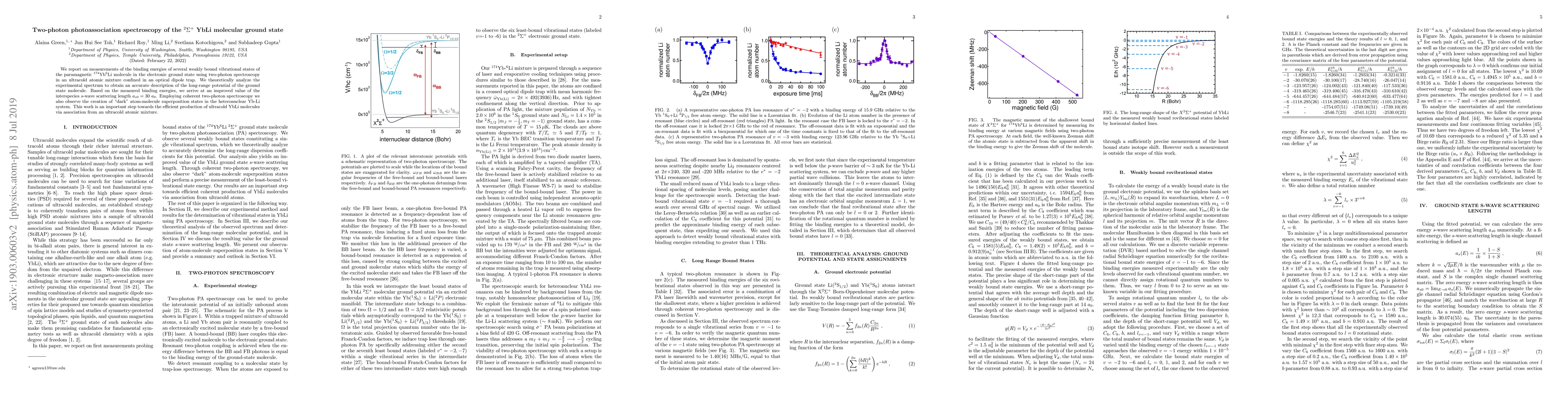 This paper reports on two-photon photoassociation spectroscopy measurements of the YbLi molecule, determining binding energies for several weakly bound states and improving the interspecies $s$-wave scattering length to $a_{s0}=30$ $a_0$. The study also observes the formation of "dark" atom-molecule superposition states, advancing the production of ultracold YbLi molecules.