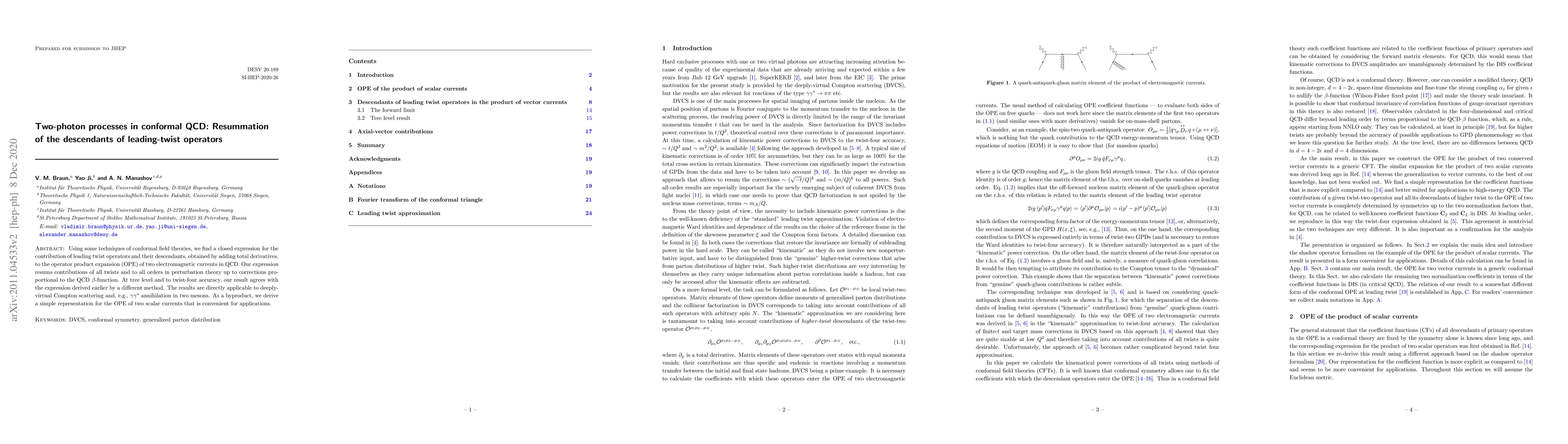 This paper presents a closed expression for the contributions of leading twist operators and their descendants in conformal QCD, using resummation techniques. The results are applicable to processes like deeply-virtual Compton scattering and $\gamma\gamma^\ast$ annihilation, and agree with previous findings at tree level and twist-four accuracy.