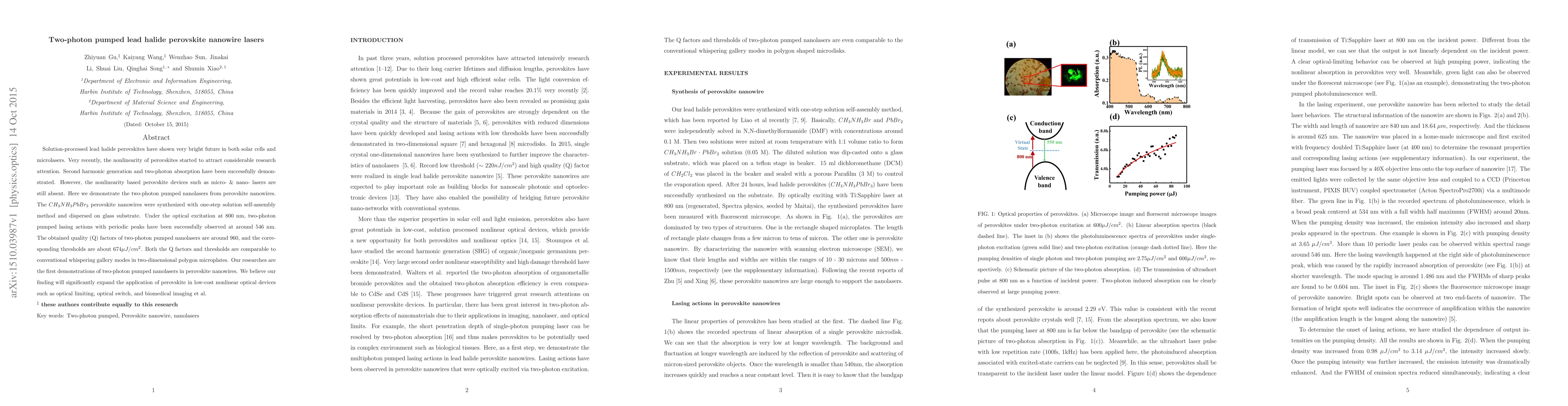 This paper demonstrates the first two-photon pumped nanolasers using CH3NH3PbBr3 perovskite nanowires synthesized via a one-step solution self-assembly method. The nanolasers exhibit periodic peaks at around 546 nm with Q factors of approximately 960 and thresholds comparable to conventional microplates, suggesting potential for low-cost nonlinear optical applications.