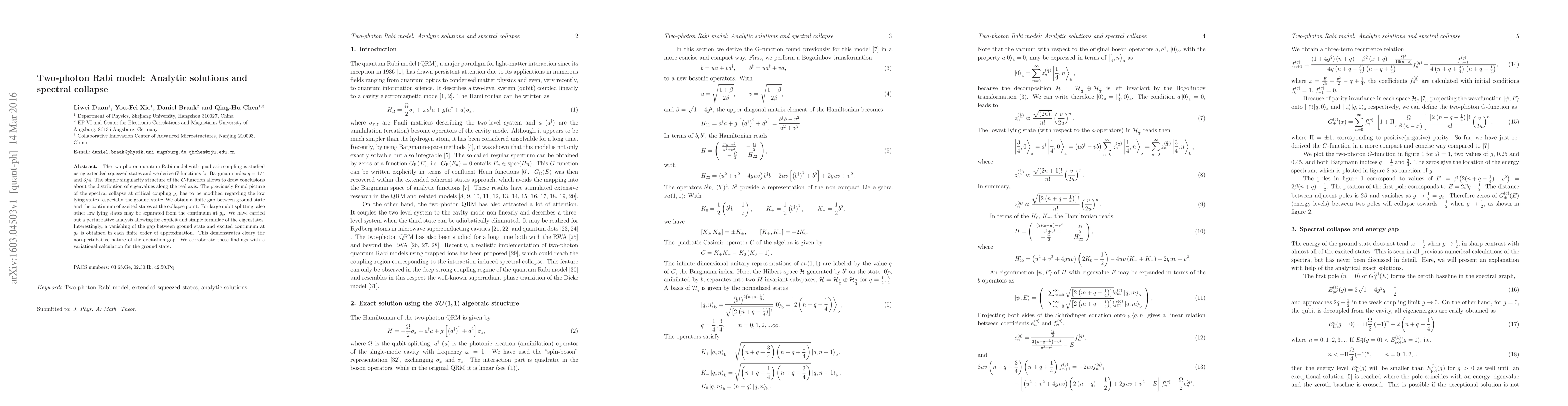 The two-photon quantum Rabi model with quadratic coupling is studied using extended squeezed states and we derive $G$-functions for Bargmann index $q=1/4$ and $3/4$. The simple singularity structure of the $G$-function allows to draw conclusions about the distribution of eigenvalues along the real axis. The previously found picture of the spectral collapse at critical coupling $g_{\mathrm{c}}$ has to be modified regarding the low lying states, especially the ground state: We obtain a finite gap between ground state and the continuum of excited states at the collapse point. For large qubit splitting, also other low lying states may be separated from the continuum at $g_{\mathrm{c}}$. We have carried out a perturbative analysis allowing for explicit and simple formulae of the eigenstates. Interestingly, a vanishing of the gap between ground state and excited continuum at $g_{\mathrm{c}}$ is obtained in each finite order of approximation. This demonstrates cleary the non-pertubative nature of the excitation gap. We corroborate these findings with a variational calculation for the ground state.