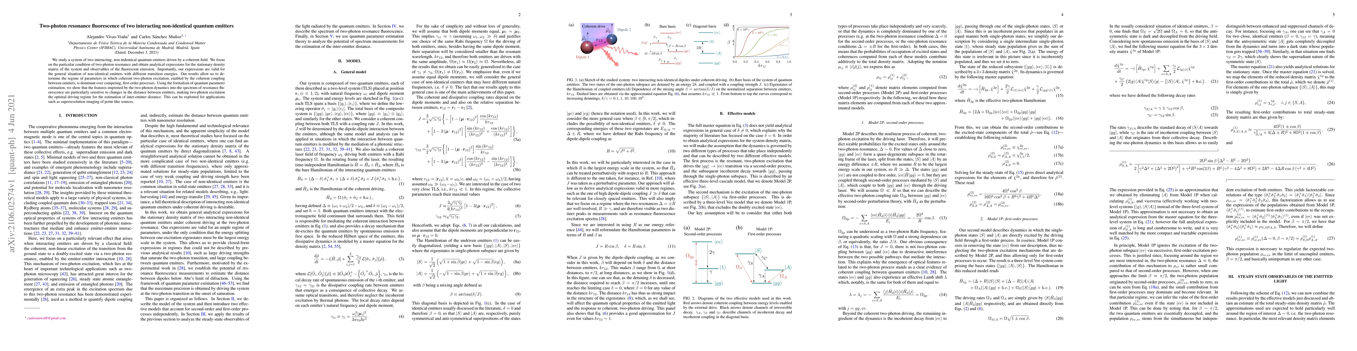 We study a system of two interacting, non-indentical quantum emitters driven by a coherent field. We focus on the particular condition of two-photon resonance and obtain analytical expressions for the stationary density matrix of the system and observables of the fluorescent emission. Importantly, our expressions are valid for the general situation of non-identical emitters with different transition energies. Our results allow us to determine the regime of parameters in which coherent two-photon excitation, enabled by the coherent coupling between emitters, is dominant over competing, first-order processes. Using the formalism of quantum parameter estimation, we show that the features imprinted by the two-photon dynamics into the spectrum of resonance fluorescence are particularly sensitive to changes in the distance between emitters, making two-photon excitation the optimal driving regime for the estimation of inter-emitter distance. This can be exploited for applications such as superresolution imaging of point-like sources.