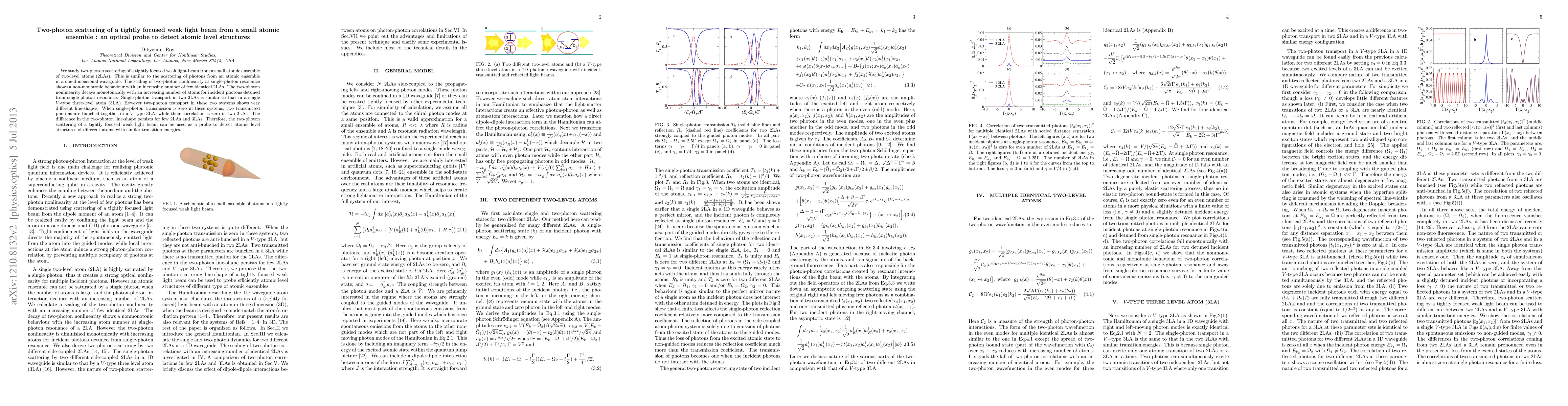 We study two-photon scattering of a tightly focused weak light beam from a small atomic ensemble of two-level atoms (2LAs). This is similar to the scattering of photons from an atomic ensemble in a one-dimensional waveguide. The scaling of two-photon nonlinearity at single-photon resonance shows a non-monotonic behaviour with an increasing number of few identical 2LAs. The two-photon nonlinearity decays monotonically with an increasing number of atoms for incident photons detuned from single-photon resonance. Single-photon transport in two 2LAs is similar to that in a single V-type three-level atom (3LA). However two-photon transport in these two systems shows very different line-shapes. When single-photon transmission is zero in these systems, two transmitted photons are bunched together in a V-type 3LA, while their correlation is zero in two 2LAs. The difference in the two-photon line-shape persists for few 2LAs and 3LAs. Therefore, the two-photon scattering of a tightly focused weak light beam can be used as a probe to detect atomic level structures of different atoms with similar transition energies.