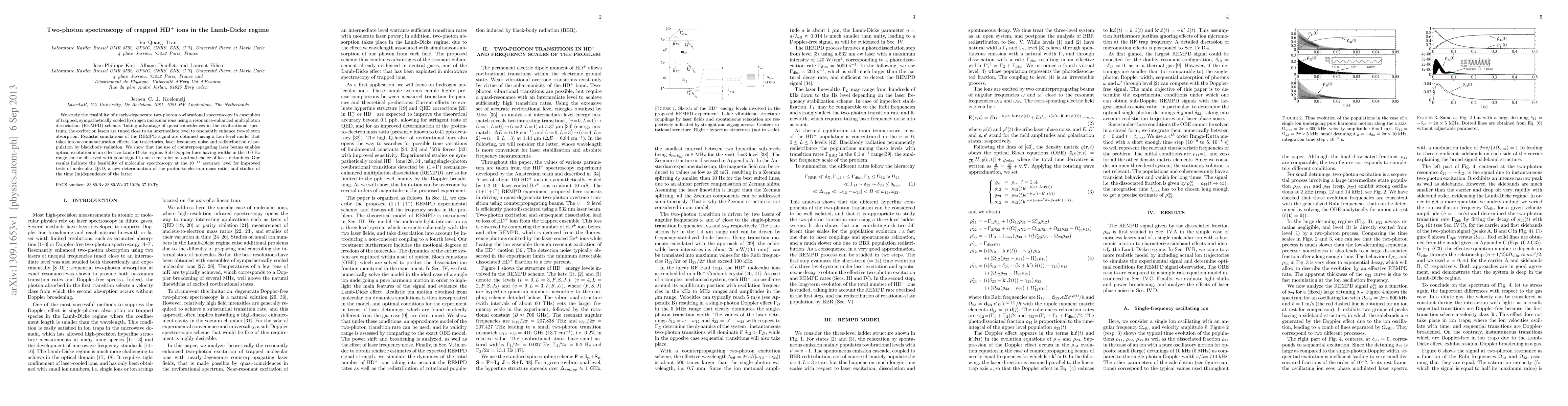 This paper explores the potential of nearly-degenerate two-photon rovibrational spectroscopy in trapped HD$^+$ ions using REMPD, demonstrating sub-Doppler lines with 100 Hz widths and high signal-to-noise ratios, which could enable precise molecular QED tests and new measurements of fundamental mass ratios.