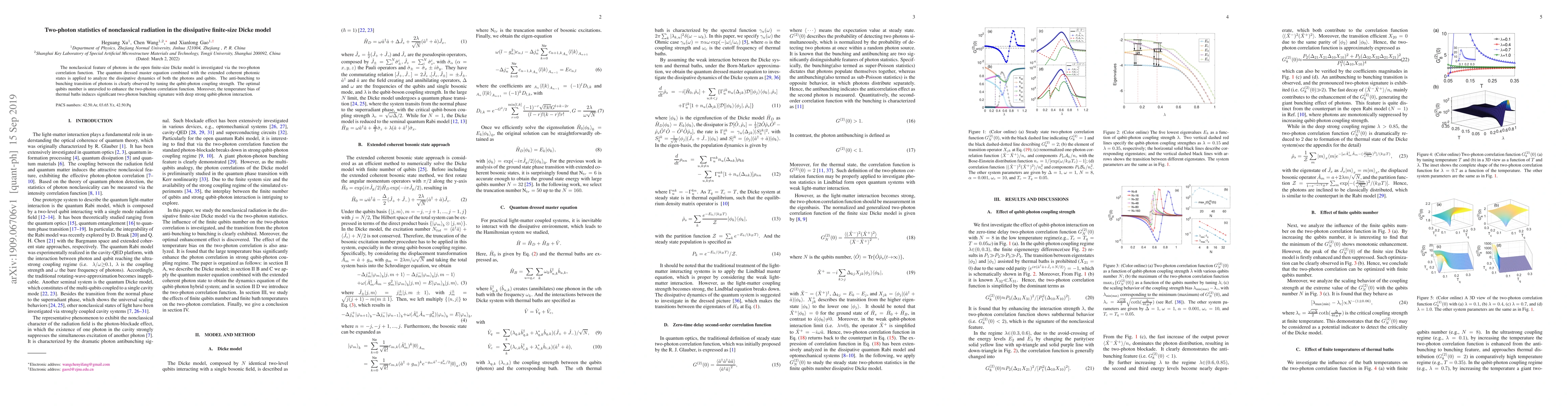 The study investigates the nonclassical properties of photons in the dissipative finite-size Dicke model using two-photon correlation functions, revealing an anti-bunching to bunching transition by adjusting qubit-photon coupling strength, and identifying optimal qubit numbers for enhanced two-photon correlations, alongside significant two-photon bunching due to thermal bath temperature effects.